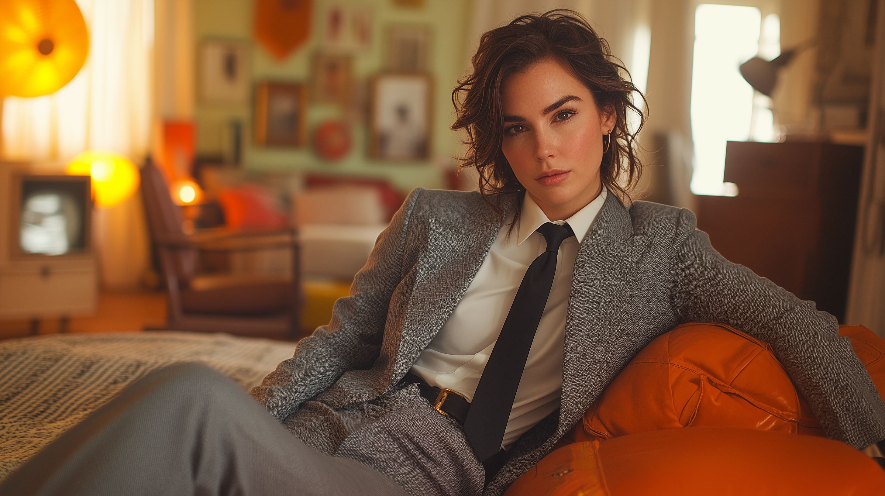 Das Bild zeigt eine selbstbewusst wirkende Geschäftsfrau in einem eleganten grauen Anzug. Sie sitzt in einer stilvollen, künstlerisch gestalteten Umgebung mit bunten Wanddekorationen und einer orangefarbenen Couch im Hintergrund. Ihr Blick ist direkt in die Kamera gerichtet, was den Eindruck von Professionalität und Entschlossenheit vermittelt.