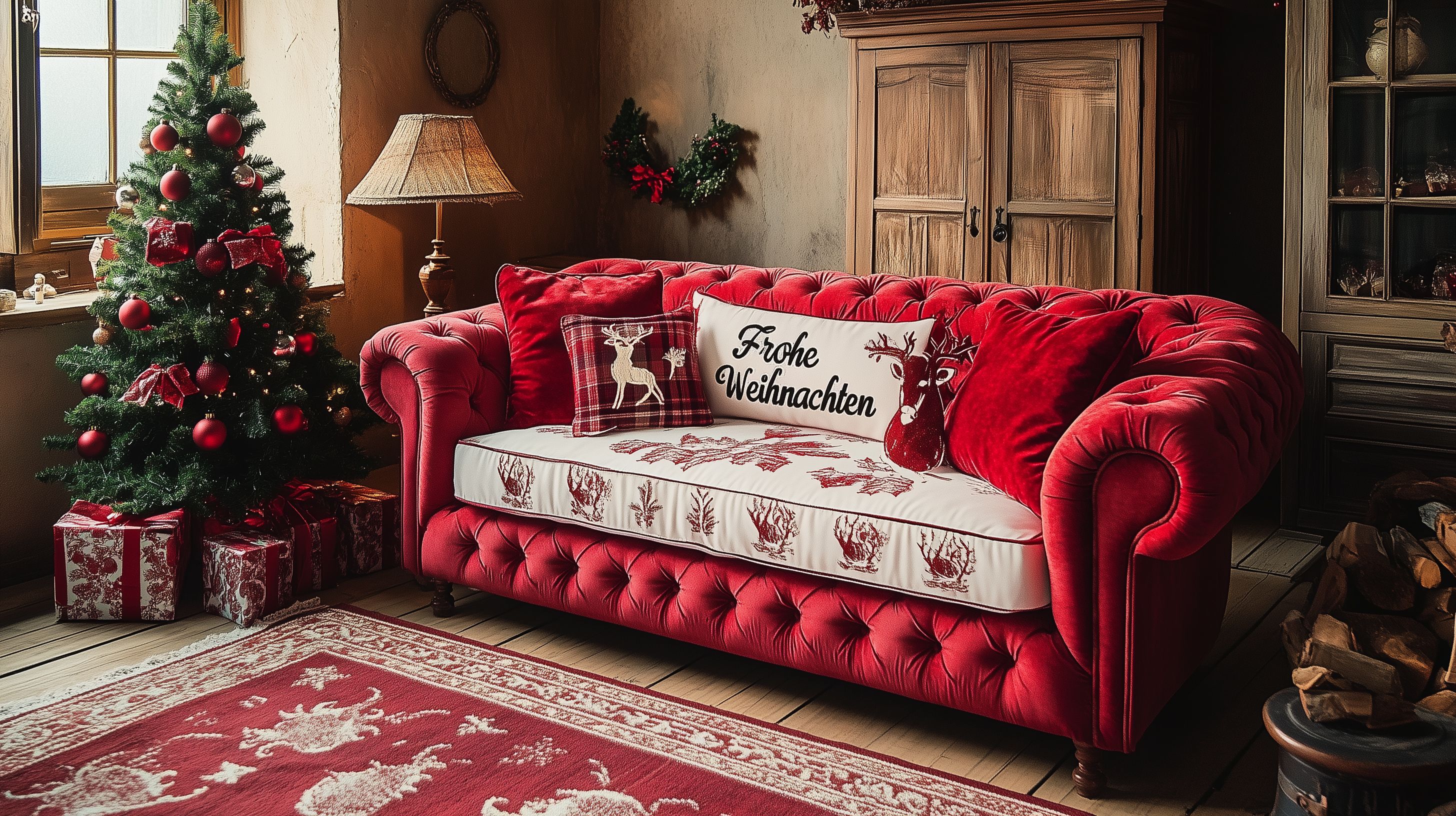 Dieses Foto zeigt ein stimmungsvoll dekoriertes Wohnzimmer mit einem üppig geschmückten Weihnachtsbaum und einem roten, tuftierten Chesterfield-Sofa. Die Wände sind in Erdtönen gehalten, und Holzmöbel wie ein Schrank und ein Sideboard verleihen dem Raum einen rustikalen, gemütlichen Charakter. Auf dem Boden liegt ein orientalischer Teppich, und eine Decke mit Hirschmotiven sowie Kissen mit Geweih-Muster unterstreichen den traditionellen Weihnachtscharme. Das Foto ist ideal für Weihnachtspost, Blogs, Social-Media-Beiträge oder Werbematerialien rund um die Feiertage. Es ist ein kostenloses Stockfoto in hoher Auflösung und steht unter einer Creative-Commons-Lizenz zur Verfügung.