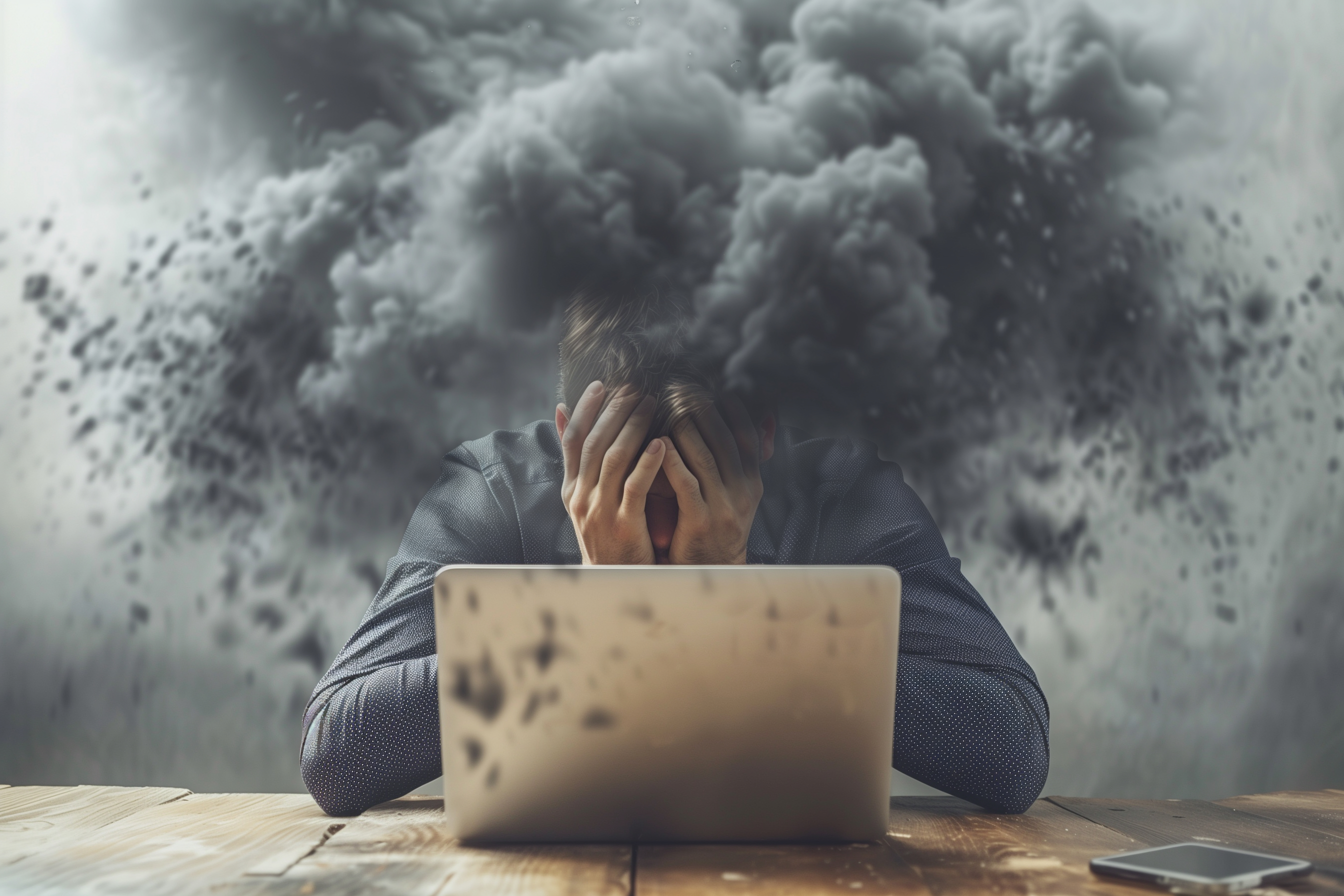 Das Foto zeigt einen Geschäftsmann, der mit beiden Händen frustriert sein Gesicht bedeckt. Er sitzt an einem Holztisch vor einem Laptop, in dessen Bildschirm sich eine bedrohliche Rauchwolke spiegelt. Die Komposition und Farbgebung in Graustufen vermitteln eine Stimmung von Krise, Stress und Überforderung. Das Bild kann in Artikeln zu Themen wie Burnout, Arbeitsdruck oder Unternehmensführung eingesetzt werden. Als kostenloses Stockfoto in hoher Auflösung und unter Creative-Commons-Lizenz eignet es sich ideal für Blogs, Newsletter oder Social-Media-Beiträge.