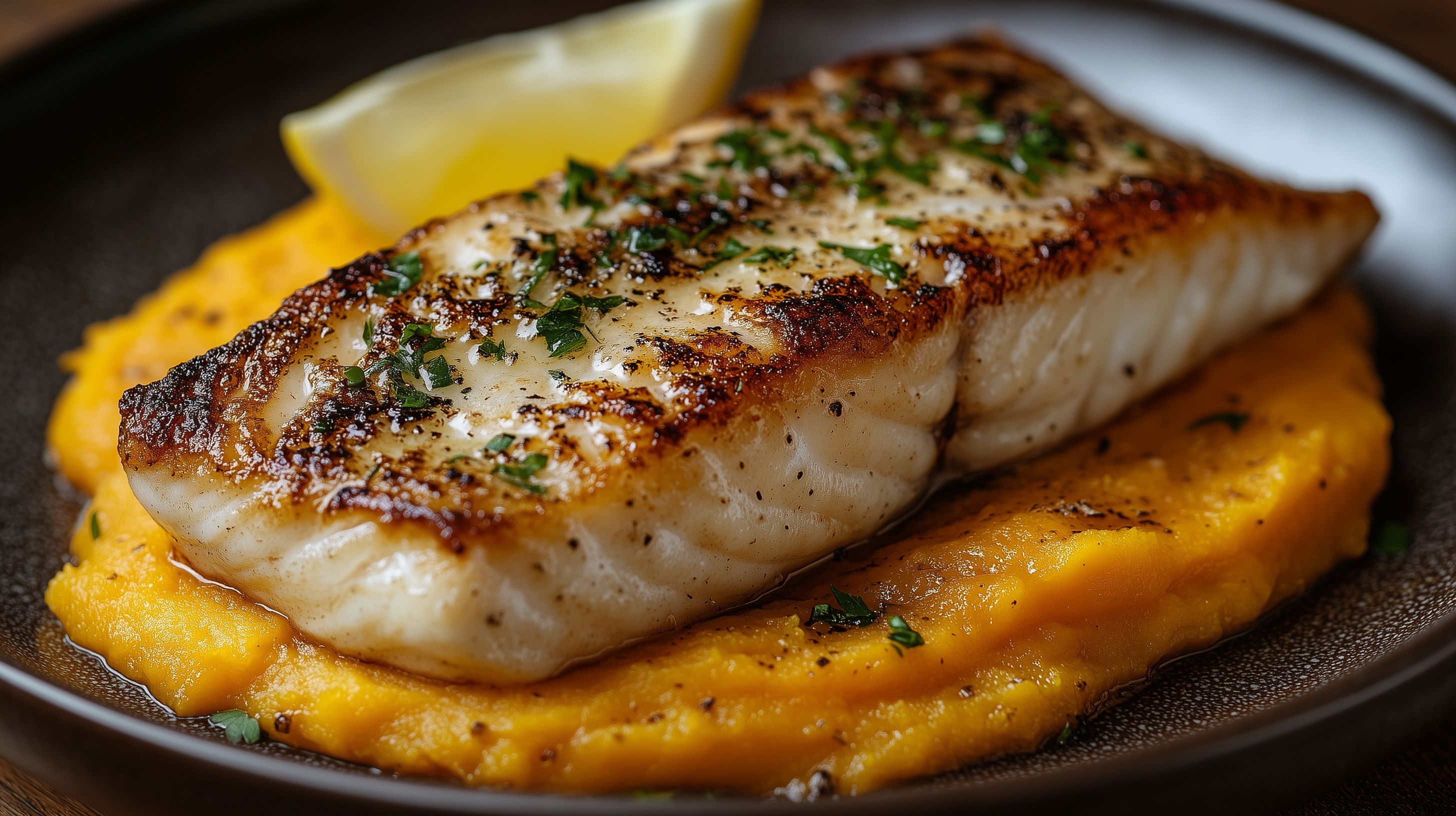 Das Foto zeigt ein appetitliches und frisch zubereitetes Kabeljaufilet, das auf einer Schicht cremiger Süßkartoffel-Creme serviert wird. Das Fischfilet ist goldbraun gebraten und mit feinen Kräutern und Gewürzen verfeinert, was ihm einen köstlichen Geschmack verleiht. Die Süßkartoffel-Creme verleiht dem Gericht eine samtige Textur und einen natürlich süßen Unterton. Zusammen ergeben Fisch und Beilage ein ausgewogenes, sättigendes und vollmundiges Hauptgericht, das sich ideal für ein gehobenes Abendessen oder ein Mittagessen eignet. Dieses hochwertige Stockfoto in hoher Auflösung ist kostenfrei und unter einer Creative-Commons-Lizenz verfügbar.