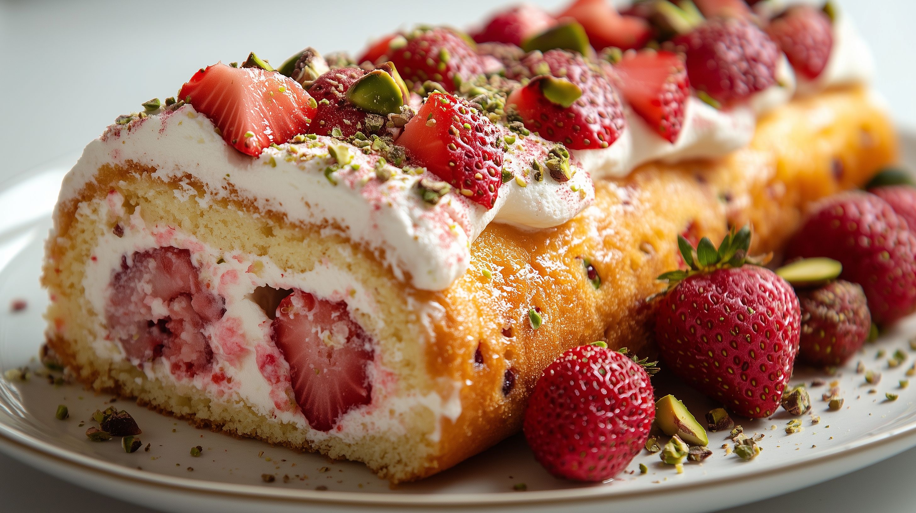 Dieses Foto zeigt eine köstliche Erdbeer-Biskuitrolle, die mit frischen Erdbeeren und grünen Pistazien dekoriert ist. Die Rolle ist auf einem hellen Teller angerichtet und hat eine cremige, weiße Füllung, die den Kontrast zu den roten Erdbeeren und grünen Nüssen bildet. Das Bild besticht durch seine natürlichen Farben, den rustikalen Stil und die appetitliche Präsentation. Diese Aufnahme eignet sich perfekt als kostenloses Stockfoto für Blogs, Newsletter, Social-Media-Kanäle oder Werbematerialien mit Bezug zu Desserts, Backen oder Sommerthemen. Die hohe Auflösung und Creative-Commons-Lizenz machen dieses Bild zu einer wertvollen Ressource für Kreative.
