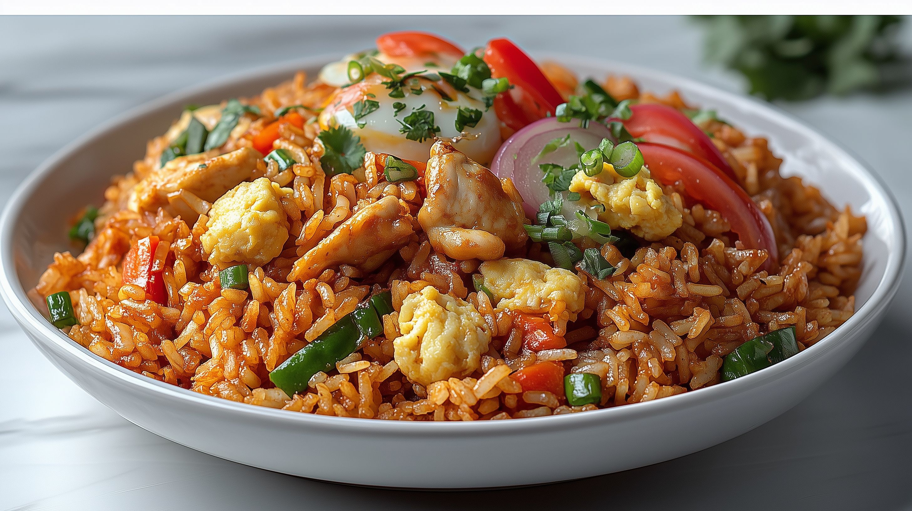 Dieses köstliche Foto zeigt ein aromatisches asiatisches Reisgericht, das als Nasi Goreng bekannt ist. Es ist gefüllt mit gegrilltem Hühnchen, frischem Gemüse wie Paprika und Zwiebeln sowie einer Vielzahl an Gewürzen und Kräutern. Das Gericht ist in einer rustikalen Schüssel angerichtet und besticht durch seine lebendigen Farben und appetitliche Optik. Das Bild eignet sich perfekt als Stockfoto für Rezeptblogs, Kochbücher oder kulinarische Werbung. Es ist in hoher Auflösung verfügbar und unter einer Creative-Commons-Lizenz frei nutzbar.