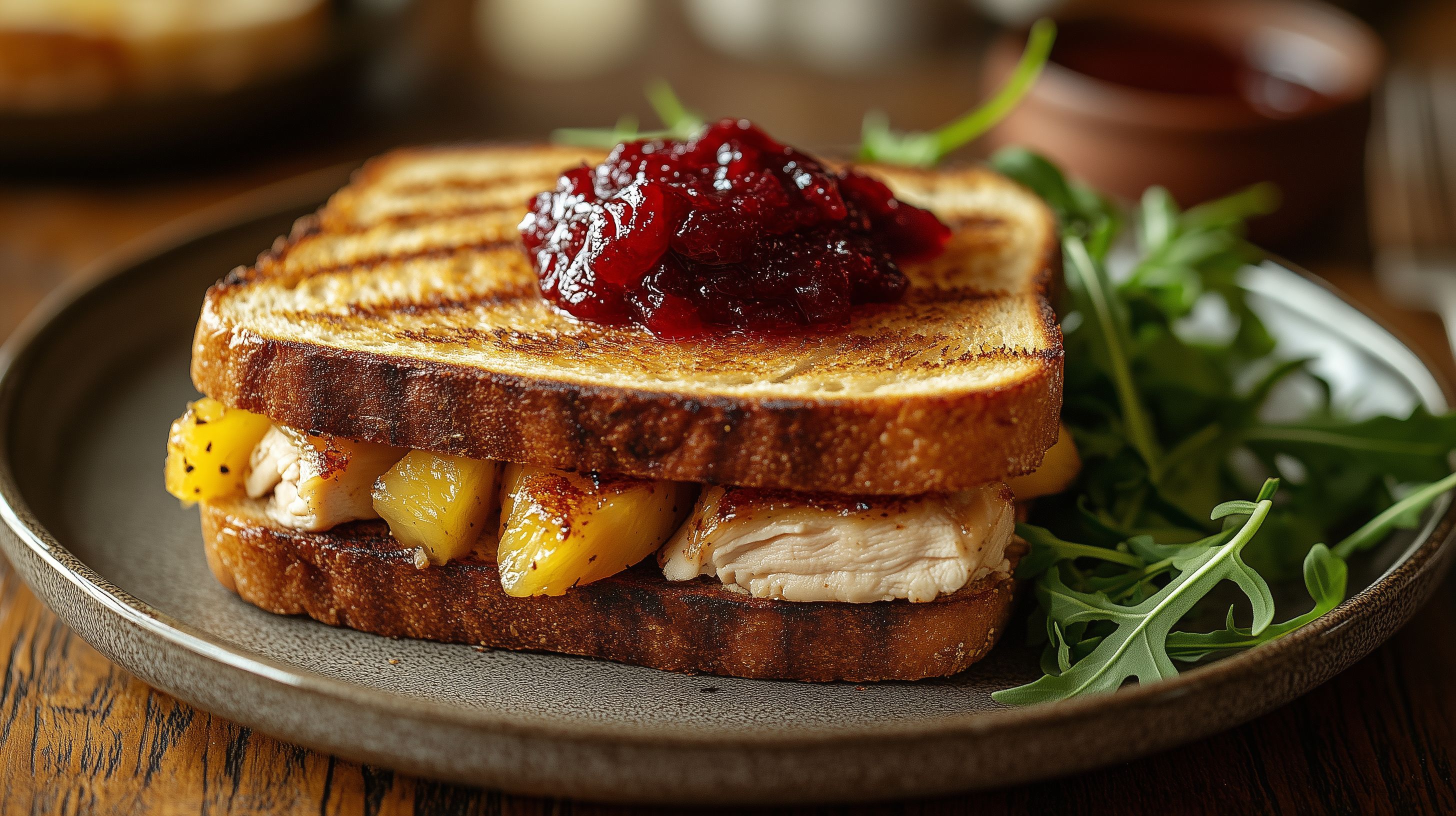 Das Foto zeigt einen knusprigen Hawaii-Toast, belegt mit saftiger Ananas und einer köstlichen Preiselbeeren-Sauce. Serviert auf einem rustikalen Holzteller, umrahmt von frischem Rucola, bietet dieses Gericht einen appetitlichen und leckeren Anblick. Der Toast ist goldbraun gegrillt, die Ananasstücke verleihen eine tropische Note, und die rote Preiselbeeren-Sauce sorgt für einen fruchtigen Kontrast. Dieses Stockfoto eignet sich perfekt für Rezeptblogs, Kochbücher, Restaurantwebsites oder Social-Media-Beiträge rund um Frühstück, Mittagessen oder Grillgerichte. Die hochauflösende Datei ist unter einer Creative-Commons-Lizenz frei für Ihre Verwendung verfügbar.