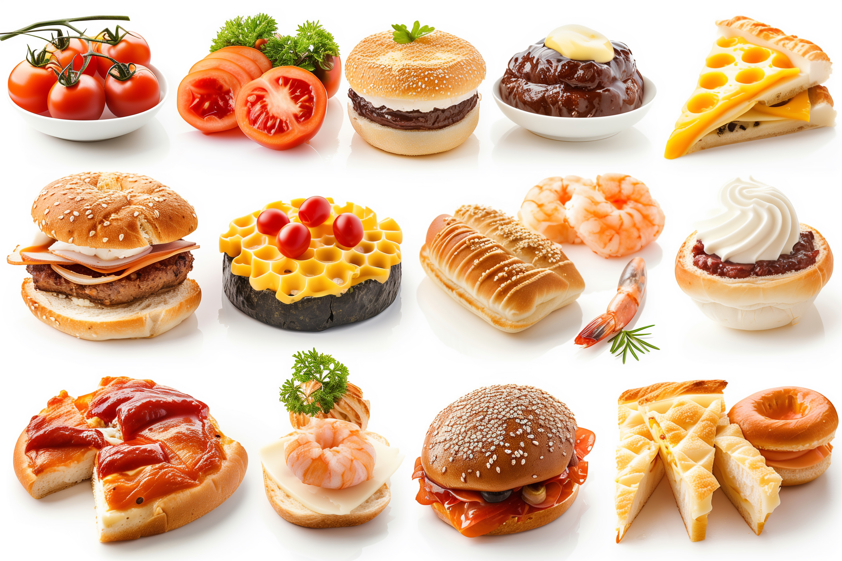 Dieses hochauflösende Stockfoto zeigt eine Vielzahl verschiedener Lebensmittel und Gerichte vor weißem Hintergrund. Zu sehen sind unter anderem Tomaten, Hamburger, Kuchen, Shrimps, Brot und mehr. Die Anordnung und Präsentation der Objekte ist sehr ansprechend und dekorativ. Dieses Foto eignet sich hervorragend für den Einsatz in Blogbeiträgen, Werbematerialien, Social-Media-Posts oder Newslettern rund um das Thema Ernährung, Kochen und Gastronomie. Als kostenloses Stockfoto unter Creative-Commons-Lizenz ist es frei verwendbar.