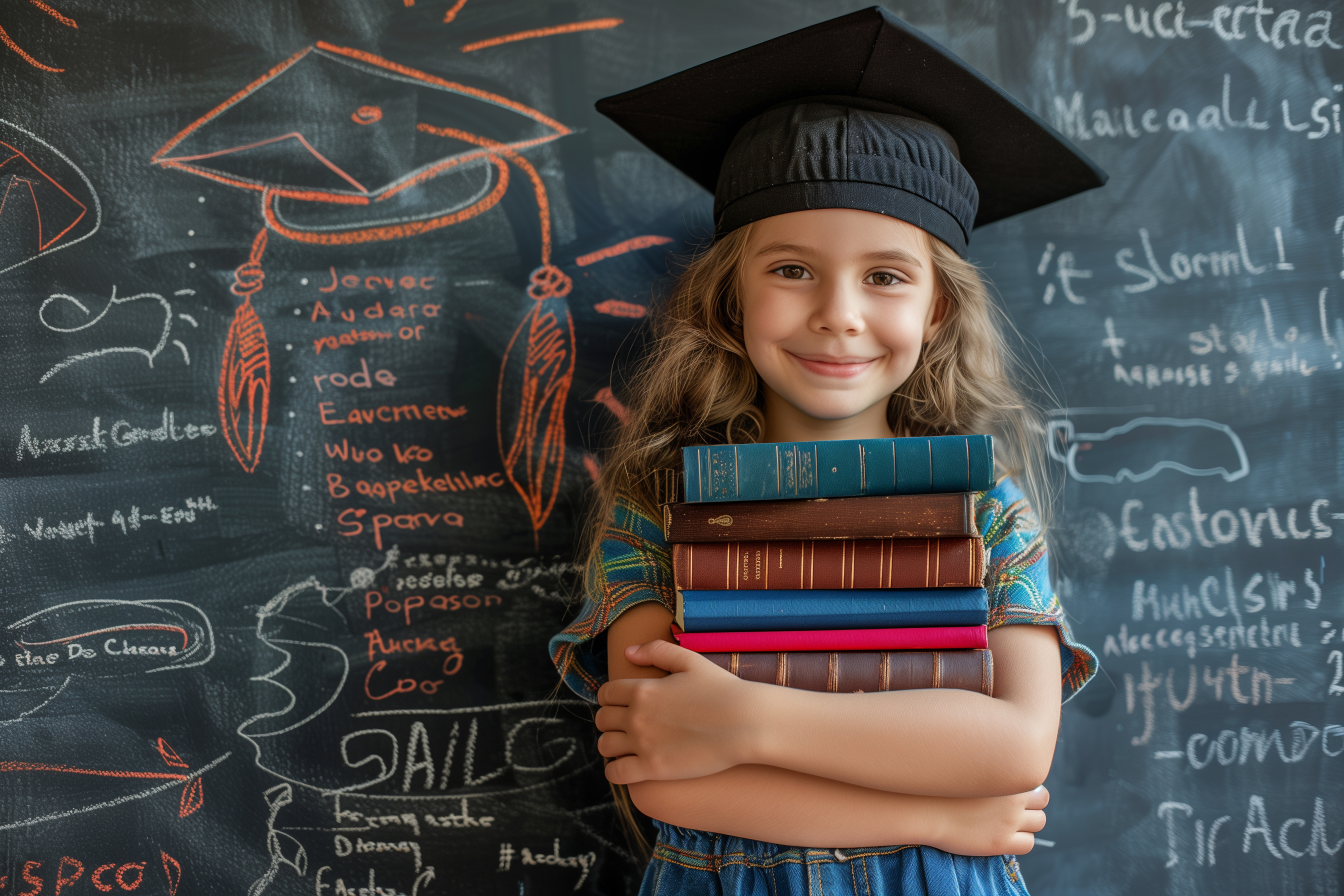Das Foto zeigt ein junges Mädchen mit lockigem Haar, das eine Abschlusskappe trägt und einen Stapel Bücher in den Armen hält. Sie steht vor einer Tafel, auf der verschiedene Symbole und Begriffe zur Bildung geschrieben sind. Das Mädchen lächelt glücklich und strahlt Erfolg und Zukunftsoptimismus aus. Das Bild vermittelt eine positive, hoffnungsvolle Atmosphäre rund um den Bildungsabschluss.