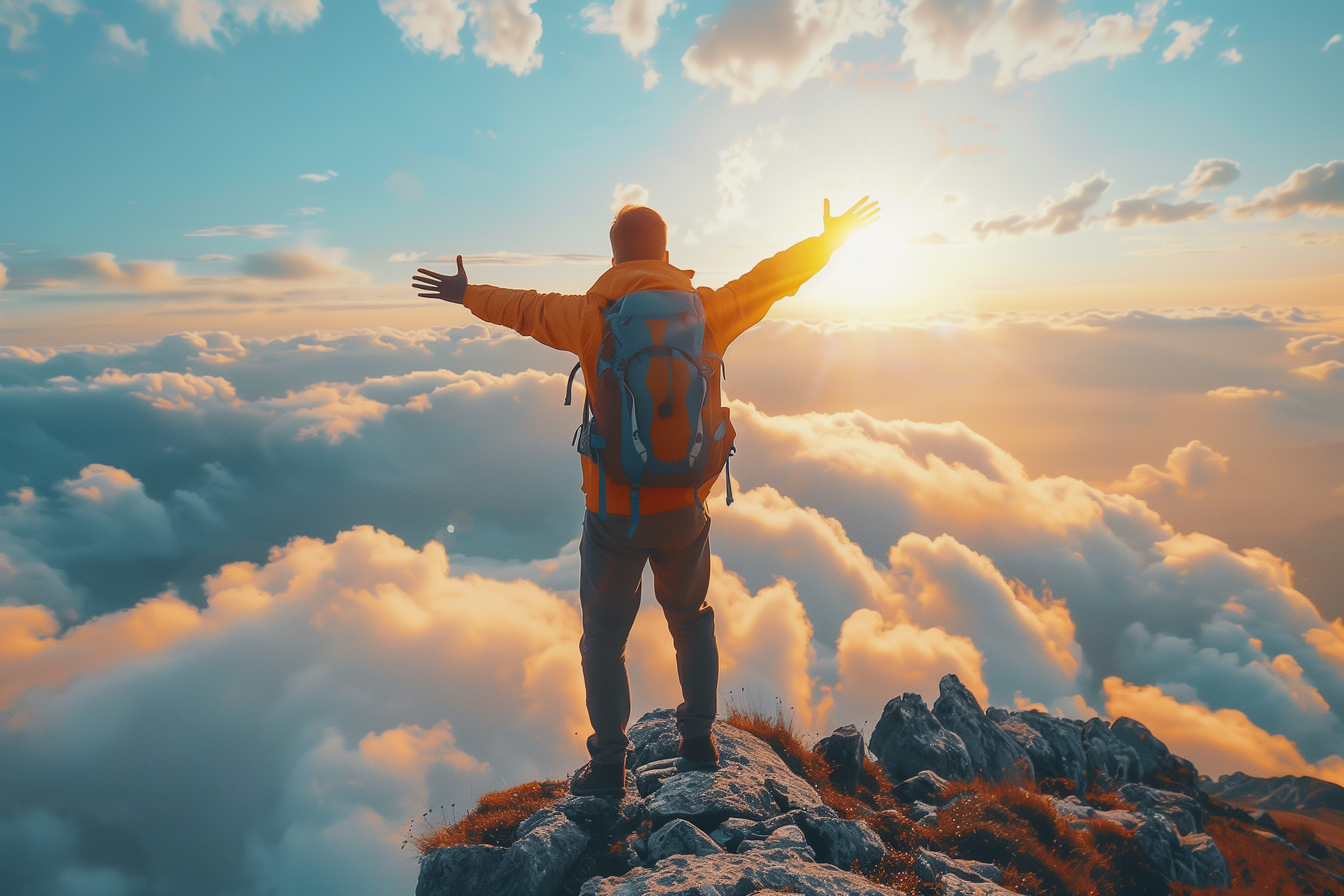 Das Foto zeigt einen Menschen, der auf der Spitze eines Berges steht und seine Arme in der Sonne erhebt. Die Perspektive lässt den Wanderer vor einem atemberaubenden Wolkenmeer und einem strahlenden Sonnenaufgang oder -untergang erscheinen. Das Bild vermittelt ein Gefühl von Freiheit, Erfolg und Überwindung. Es eignet sich hervorragend für den Einsatz in Blogs, Newslettern, sozialen Medien und Werbematerialien, die Themen wie Motivation, Inspiration, Outdoor-Aktivitäten oder Reisen aufgreifen. Als hochwertiges, kostenloses Stockfoto in hoher Auflösung und unter einer Creative-Commons-Lizenz verfügbar, bietet es vielfältige Möglichkeiten für kreative Gestaltungen.