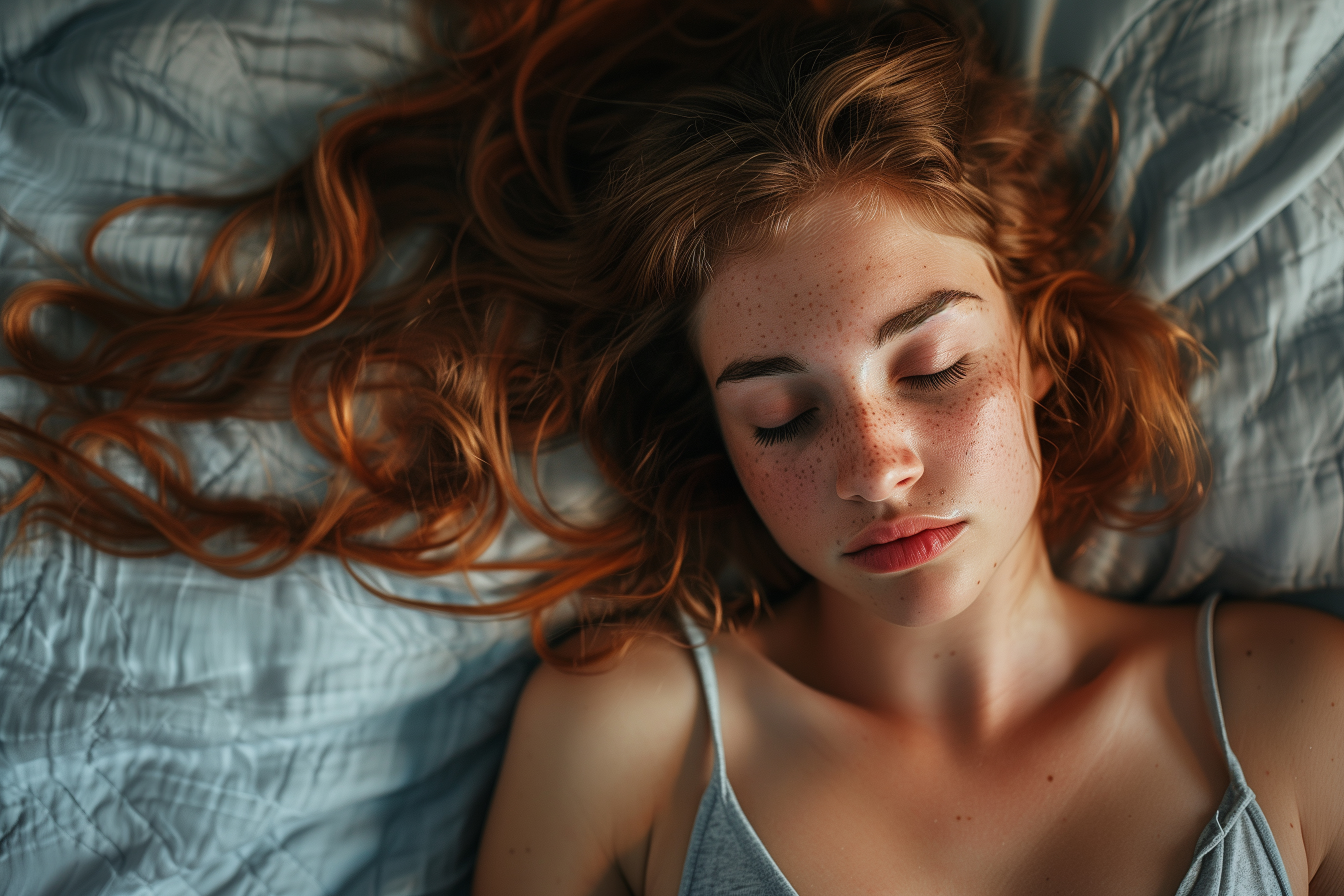 Das Foto zeigt eine junge Frau mit auffallend roten, lockigen Haaren, die entspannt auf einem Bett liegend zu sehen ist. Ihre Augen sind geschlossen und ihr Gesichtsausdruck wirkt friedlich und verträumt. Die Beleuchtung ist natürlich und lässt die Haare und Haut der Frau warm erstrahlen. Die Komposition konzentriert sich ganz auf das Gesicht und die Haare, während der Hintergrund verschwommen erscheint.