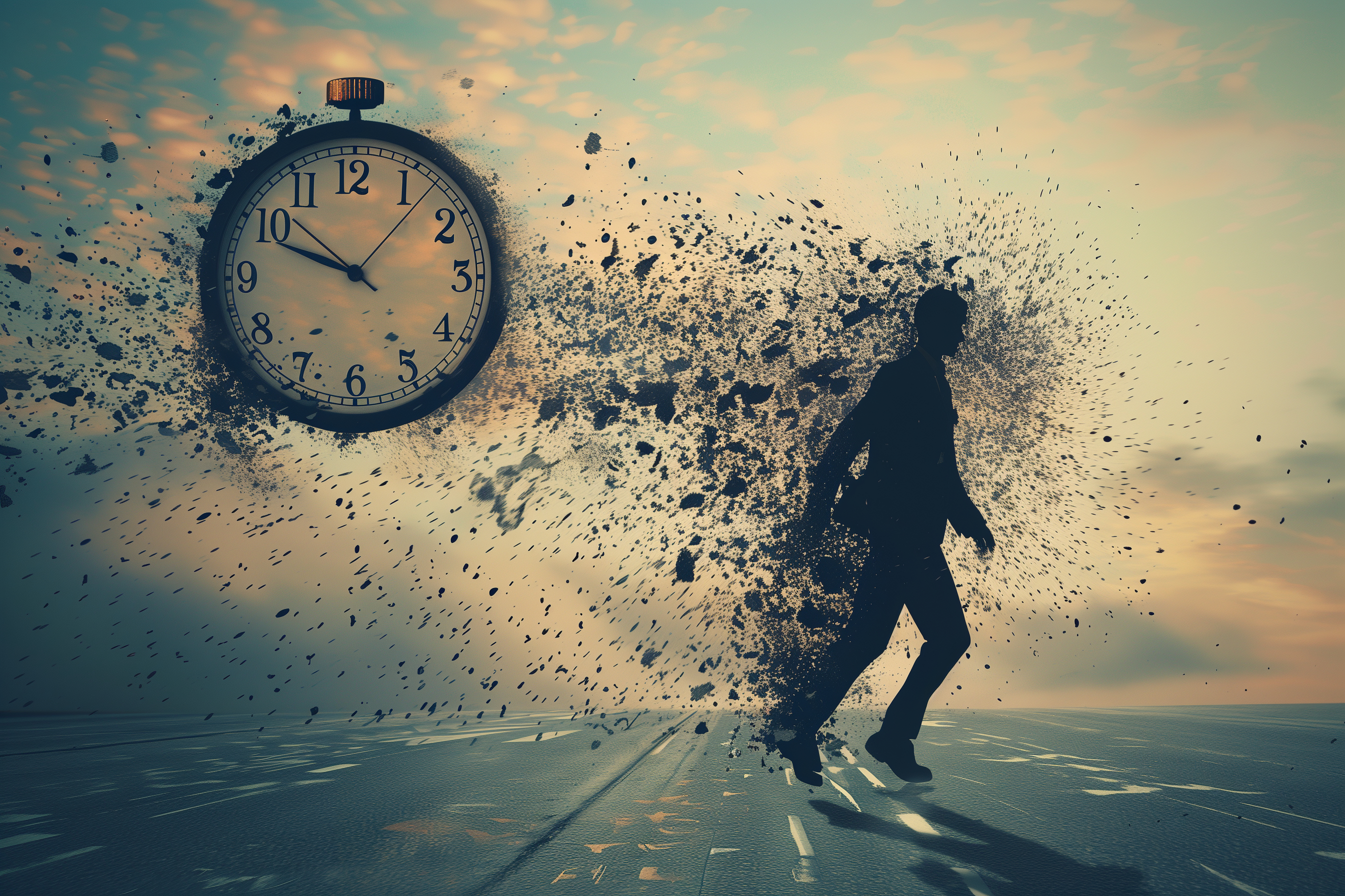 Das Bild zeigt eine surreale Szene, in der die Silhouette einer Person durch Zerfallseffekte läuft, während eine große Uhr im Hintergrund zu sehen ist. Die Komposition ist klar und fokussiert, mit einer Mischung aus Blau- und Orangetönen, die eine mystische Stimmung erzeugen.