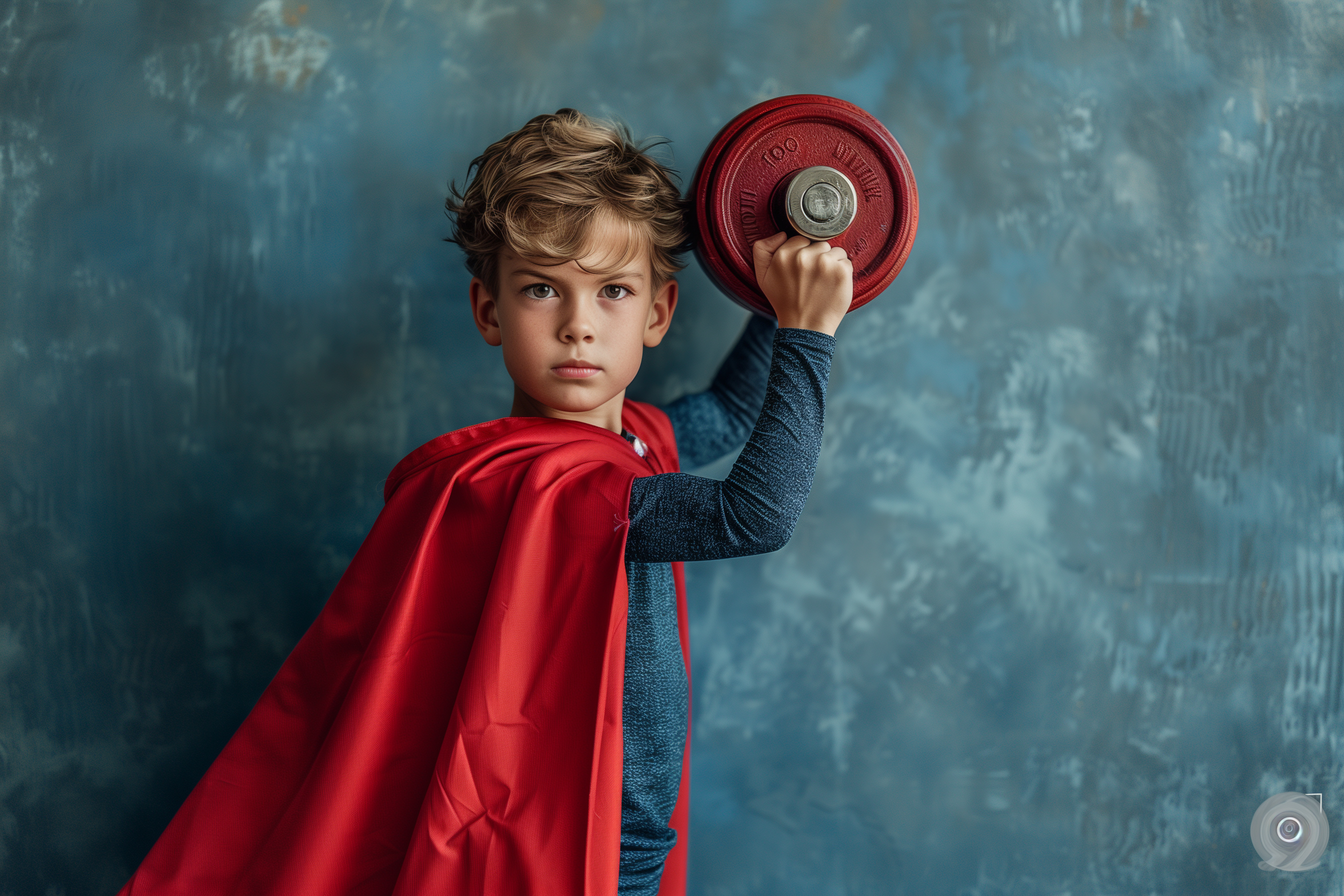 Das Foto zeigt einen jungen Jungen, der konzentriert einen schweren roten Gewichtsring stemmt. Er trägt einen roten Umhang, der seine Bewegung unterstreicht und ihm ein superheldenhaftes Aussehen verleiht. Der Hintergrund ist dunkel und blau gehalten, wodurch die Aufmerksamkeit ganz auf den Jungen und seine Anstrengung gerichtet wird.