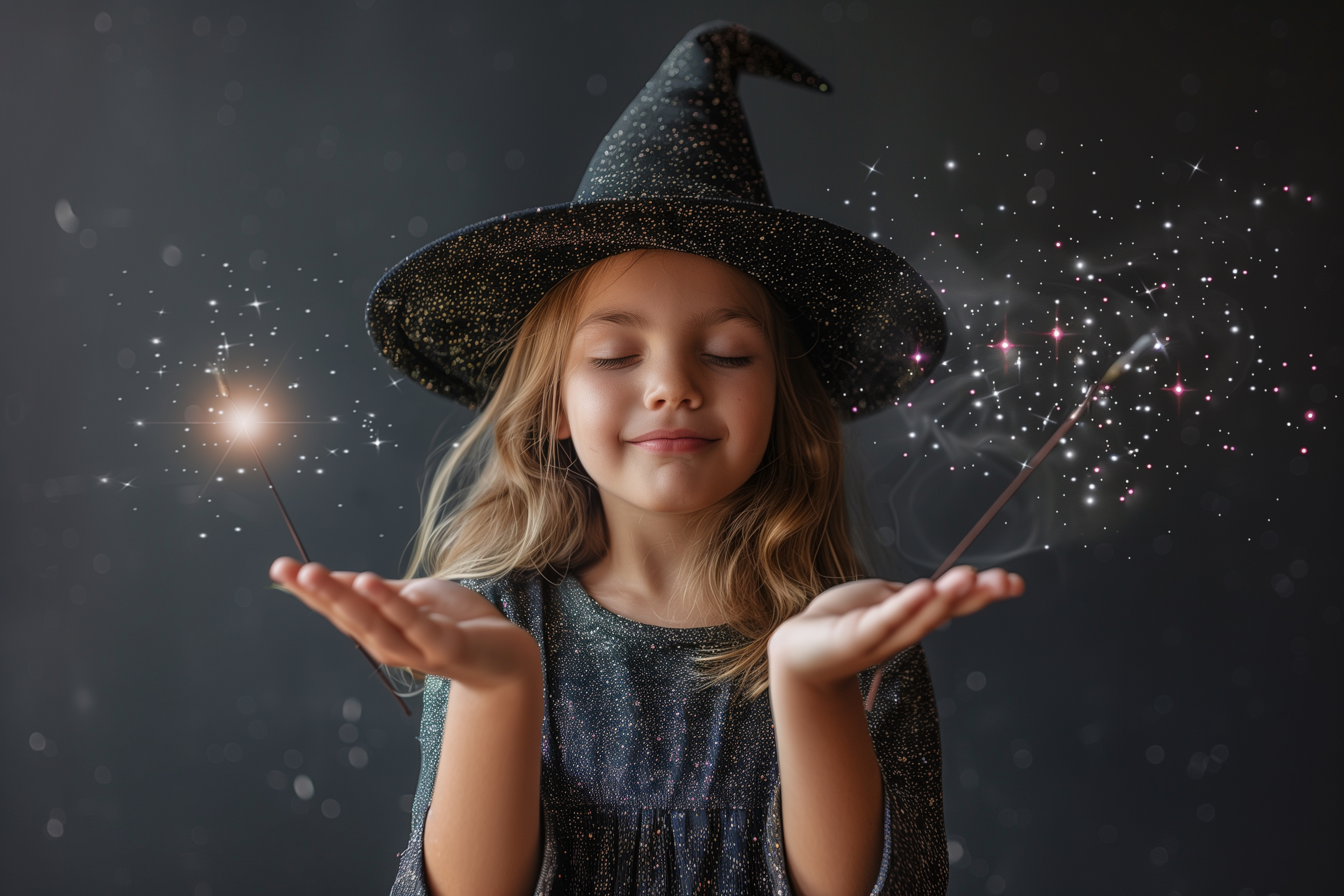 Das Bild zeigt ein Mädchen in einem glitzernden Hexenkostüm, das mit geschlossenen Augen seine Hände ausstreckt, als würde es zauberhafte Magie herbeibeschwören. Die Szenerie ist in ein stimmungsvolles Dunkel getaucht, das durch funkelnde Sterne und Glitzerpartikel erhellt wird. Das Kind versprüht eine geheimnisvolle, fantasievolle Ausstrahlung, die den Betrachter in eine Welt der Wunder und Wünsche entführt.
