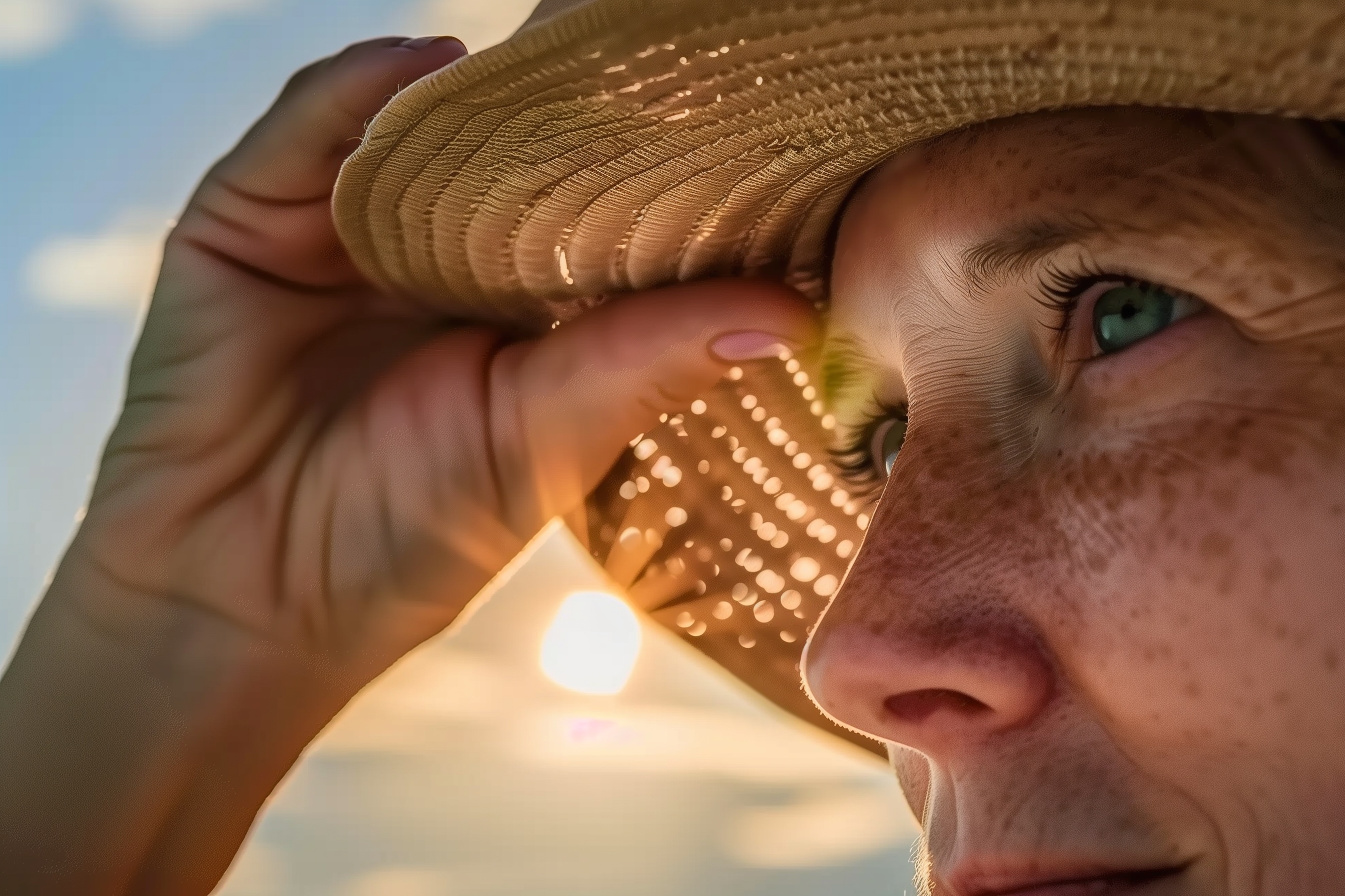 Das Bild zeigt einen Nahaufnahmeausschnitt eines Gesichts, das teilweise von einem Strohhut beschattet wird. Das Gesicht ist vom Sonnenlicht beleuchtet, was einen warmen, stimmungsvollen Effekt erzeugt. Der Fokus liegt auf den grünen Augen, deren Blick konzentriert und nachdenklich erscheint. Das Foto vermittelt eine Atmosphäre der Ruhe und Entspannung an einem sommerlichen Tag.