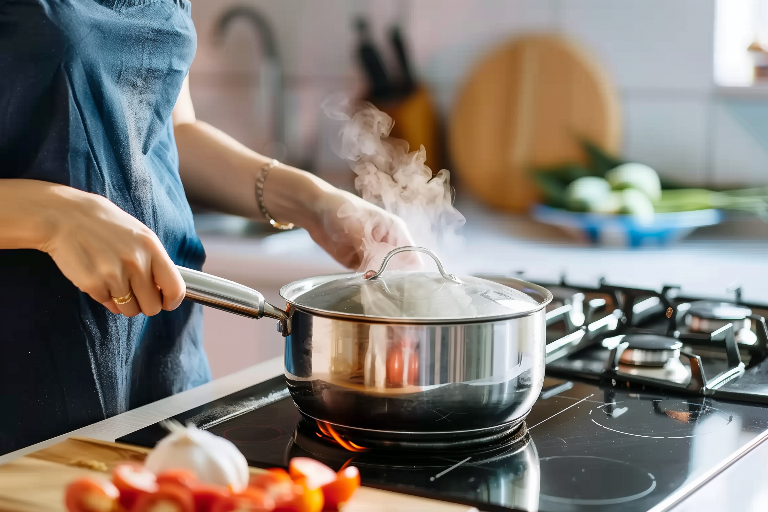 Das Foto zeigt einen Gasherd in einer Küche, auf dem ein dampfender Topf steht. Der Dampf steigt aus dem Topf auf, was auf eine laufende Zubereitung von Speisen hinweist. Im Hintergrund sind weitere Küchenutensilien wie Schneidebrett und Früchte zu sehen, die auf eine aktive Küchentätigkeit schließen lassen. Das Bild vermittelt den Eindruck einer natürlichen, realistischen Küchensituation und könnte für verschiedene Einsatzzwecke wie Kochblogs, Rezeptportale oder Werbung für Küchengeräte verwendet werden. Als kostenloses Stockfoto in hoher Auflösung und unter Creative-Commons-Lizenz ist es für viele Anwendungen geeignet.