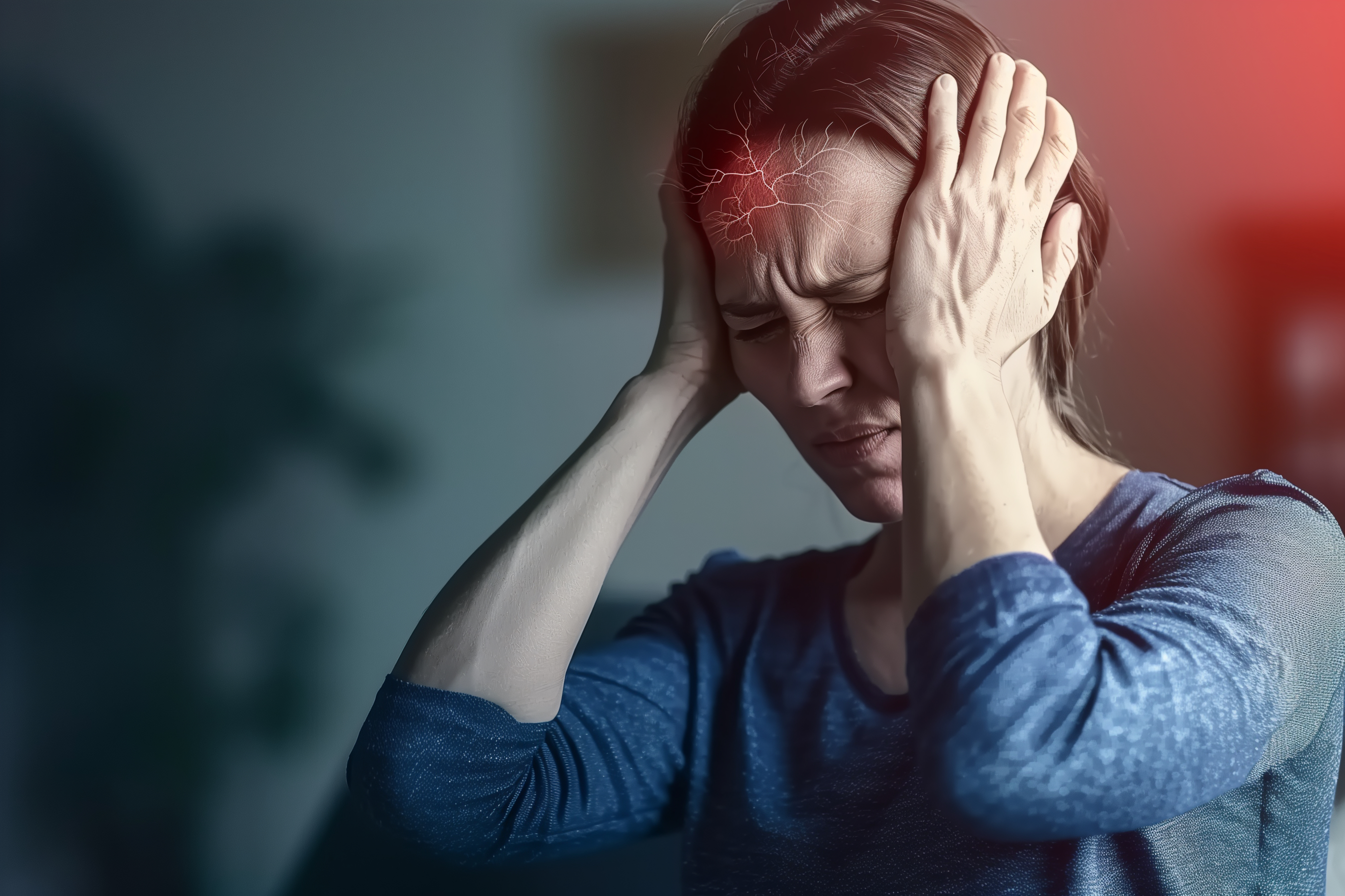 Das Bild zeigt eine Frau, die offensichtlich unter starken Kopfschmerzen leidet. Mit geschlossenen Augen und an den Kopf gepressten Händen wirkt sie verzweifelt und erschöpft. Die Farbgebung ist dunkel und kalt, mit kontrastierenden Rot- und Blautönen, die die Stimmung verstärken. Diese Aufnahme könnte für Artikel oder Social-Media-Beiträge zu Themen wie Gesundheit, Stress oder psychisches Wohlbefinden eingesetzt werden. Als hochwertiges, kostenloses Stockfoto unter Creative-Commons-Lizenz eignet es sich hervorragend für verschiedenste Einsatzzwecke.