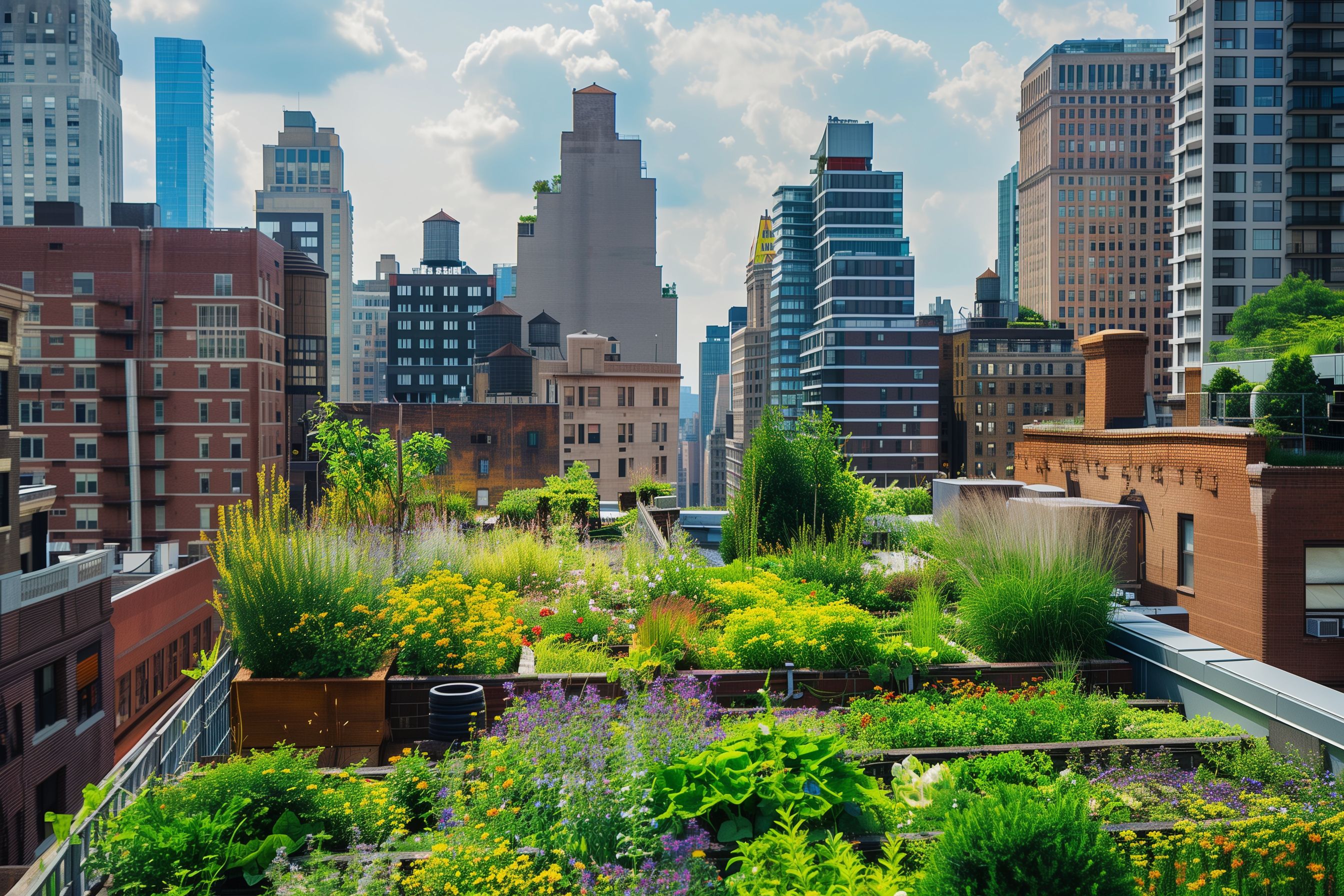 Dieses beeindruckende Foto zeigt einen üppigen, begrünten Garten hoch oben auf dem Dach eines modernen Hochhauskomplexes in einer Großstadt. Aus der Vogelperspektive ist eine faszinierende Szenerie zu sehen: Bunte Blumen, Sträucher und Gräser erstrecken sich auf einer Dachfläche, umgeben von den imposanten Wolkenkratzern der Stadtkulisse. Die Kombination aus der natürlichen Bepflanzung und der urbanen Architektur schafft einen stimmungsvollen Kontrast und ein visuell ansprechendes Gesamtbild.
