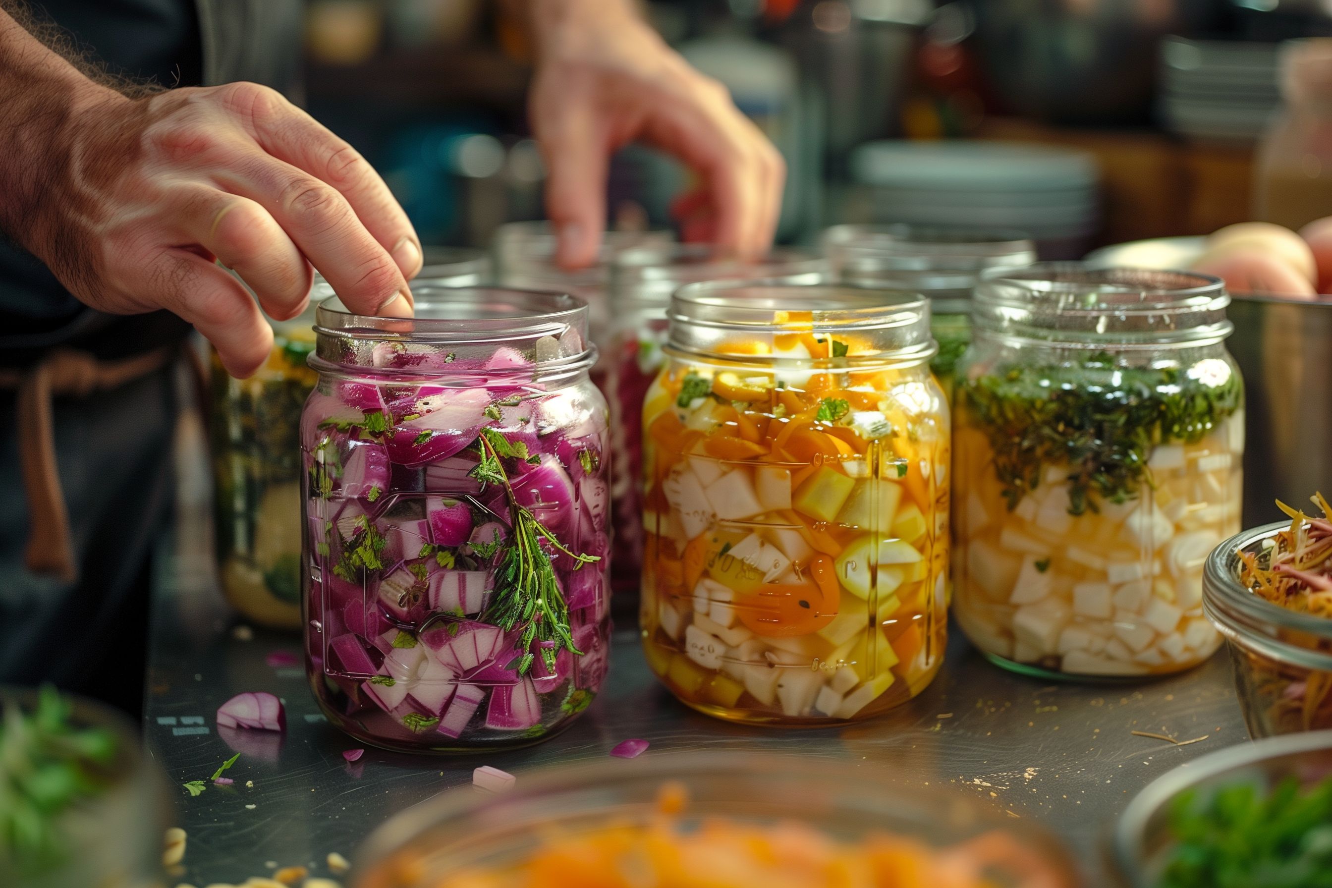 Das Bild zeigt eine Reihe von Einmachgläsern, die mit verschiedenen fermentierten Lebensmitteln gefüllt sind. Im Vordergrund sind rote Zwiebeln, gelbe Paprika und grüne Kräuter zu sehen, die in klaren Gläsern eingelegt sind. Die Komposition wirkt natürlich und farbenfroh. Das Bild vermittelt den Eindruck von Hausgemacht, Gesundheit und einer bewussten, natürlichen Ernährungsweise.