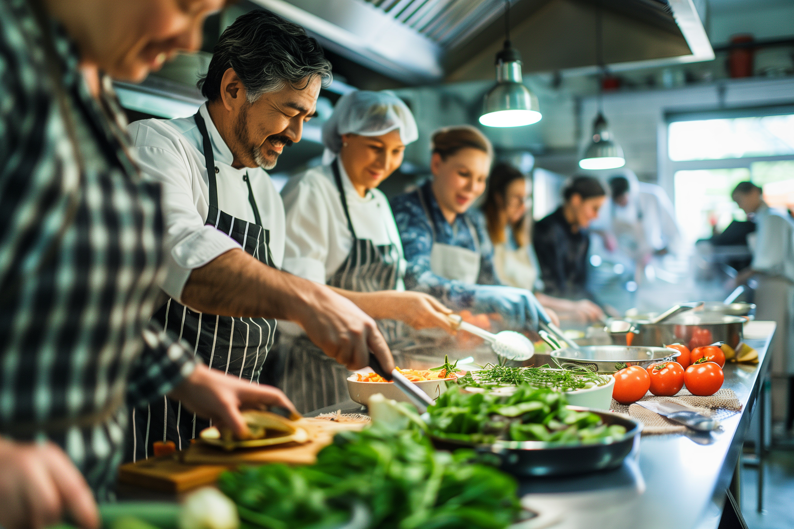 Das Bild zeigt ein professionelles Küchenteam bei der Zubereitung von Speisen. Es ist eine dynamische Nahaufnahme, die den Fokus auf die Arbeit der Köche und ihre Interaktion legt. Die kräftigen Farben, die lebhafte Atmosphäre und die Konzentration der Mitarbeiter vermitteln eine inspirierende Stimmung in der Küche.