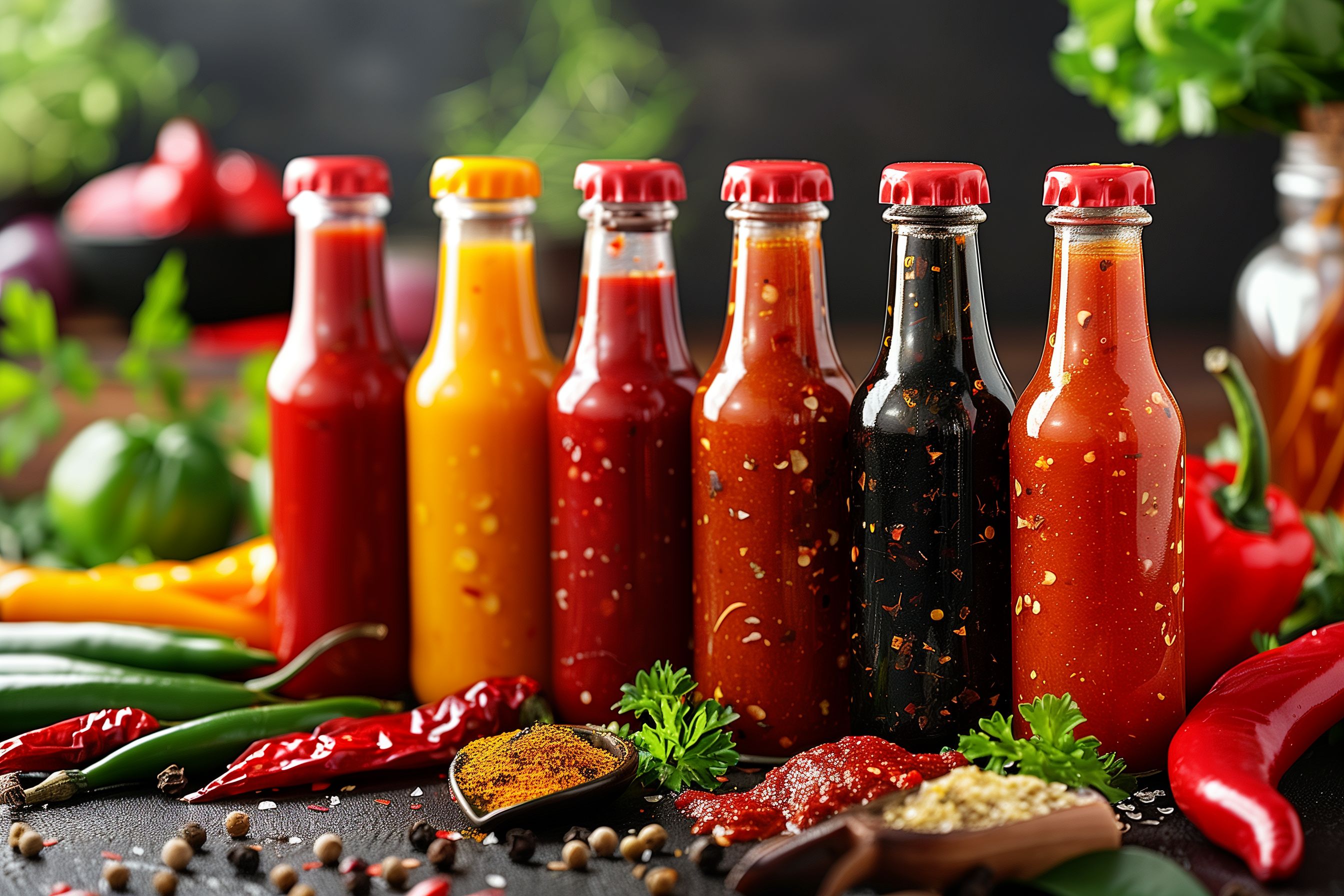 Dieses farbenfrohe und detaillierte Foto zeigt eine Auswahl an würzigen Saucen und Gewürzen. Im Vordergrund sind verschiedene Fläschchen mit rot, orange und schwarzen Flüssigkeiten zu sehen, die vermutlich Ketchup, Senf und andere Soßen enthalten. Im Hintergrund sind frische Zutaten wie rote und grüne Paprikaschoten, Kräuter sowie Gewürze wie Pfeffer zu erkennen, die die Vielfalt und Lebendigkeit des Motivs unterstreichen. Das Bild hat eine professionelle und hochwertige Anmutung, die sich gut für den Einsatz in Blogs, Newslettern, Social-Media-Kanälen oder Werbematerialien zum Thema Kochen, Gastronomie oder Lebensmittel eignet. Dieses kostenlose Stockfoto in hoher Auflösung steht unter einer Creative-Commons-Lizenz zur Verfügung.