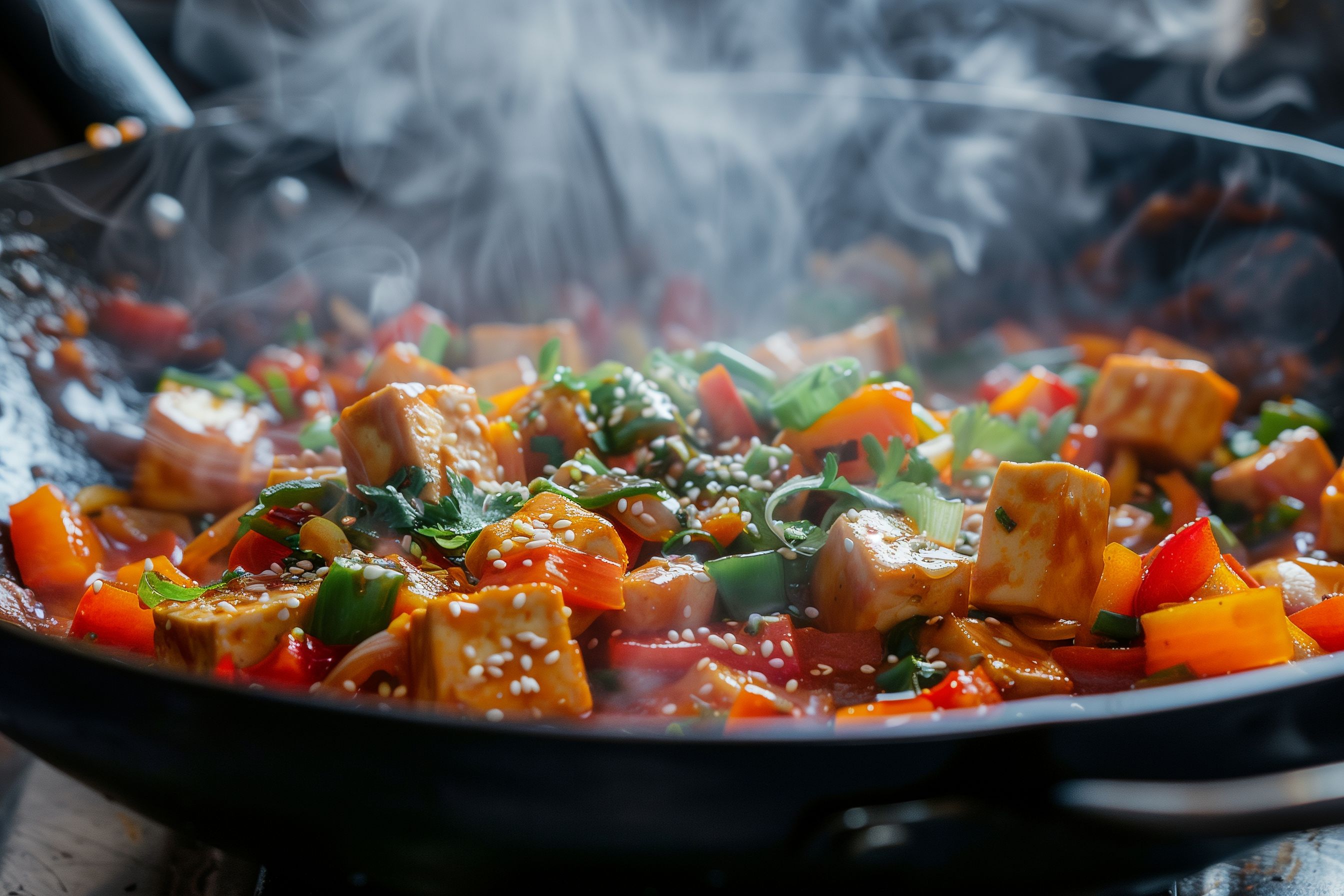Dieses Foto zeigt ein dampfendes, asiatisches Gemüsegericht in einer Pfanne. Die Perspektive ist so gewählt, dass die Zutaten wie Paprikastücke, Karotten, Brokkoli und andere knackige Gemüsestreifen im Vordergrund deutlich sichtbar sind. Der Dampf über der Pfanne verleiht dem Bild eine besonders appetitliche Atmosphäre. Diese hochauflösende Aufnahme eignet sich hervorragend als kostenloses Stockfoto für Blogger, Social-Media-Kanäle oder Werbekampagnen rund um gesunde, vegetarische Ernährung und asiatische Küche. Das Bild steht unter einer Creative-Commons-Lizenz zur freien Verwendung zur Verfügung.