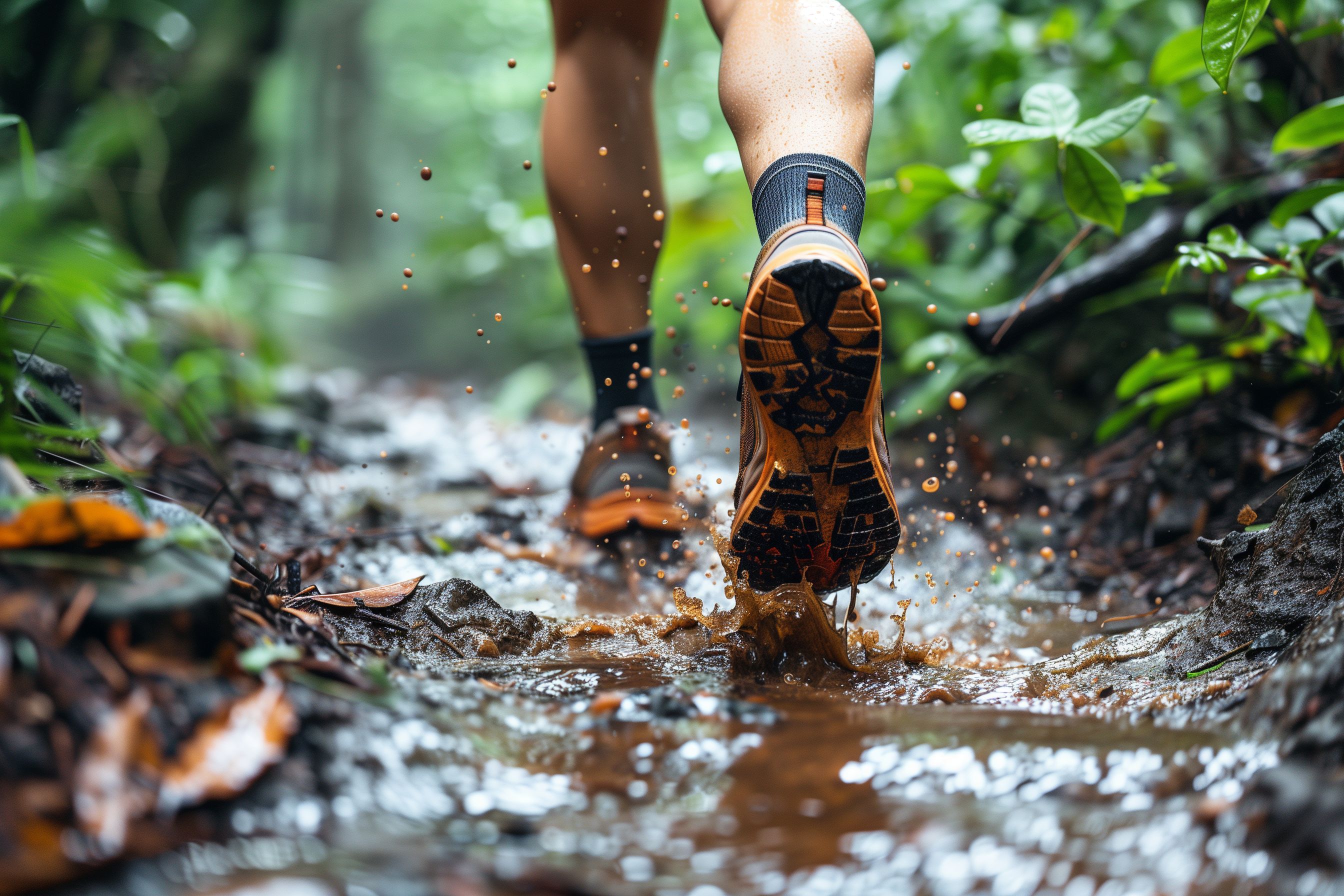 Das Bild zeigt eine Person, die einen schlammigen Waldweg durchquert. Ihre Füße sind in Matsch und Wasser eingetaucht, während sie sich durch die üppige, grüne Vegetation des Waldes bewegt. Die Perspektive ist auf die Beine und Füße des Wanderers fokussiert, was die Dynamik und Bewegung des Moments betont. Die Farbpalette ist warm und natürlich, mit Braun-, Grün- und Erd-Tönen, die eine natürliche und rustikale Atmosphäre schaffen. Dieses Stockfoto eignet sich ideal für die Verwendung in Blogs, Newslettern, auf Social-Media-Kanälen oder in Werbekampagnen, die eine natürliche, abenteuerliche und aktive Stimmung vermitteln möchten. Das Bild ist in hoher Auflösung und unter einer Creative-Commons-Lizenz verfügbar.