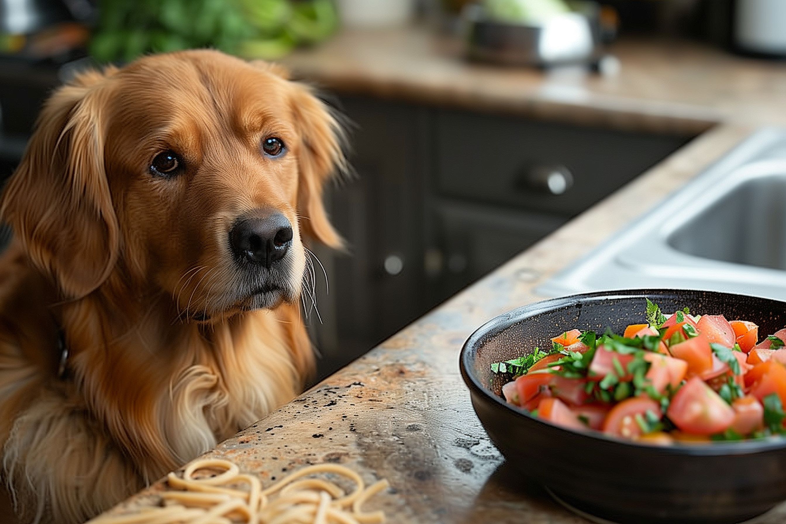 Das Foto zeigt einen Hund, der gierig in Richtung einer Schüssel mit frisch zubereitetem Gemüsesalat blickt. Der Hund ist ein Golden Retriever mit einem dichten, hellen Fell und einem freundlichen Blick. Die Küchenumgebung mit den Küchenutensilien und der Anordnung der Zutaten auf der Arbeitsplatte verleiht dem Bild eine heimelige, häusliche Atmosphäre.