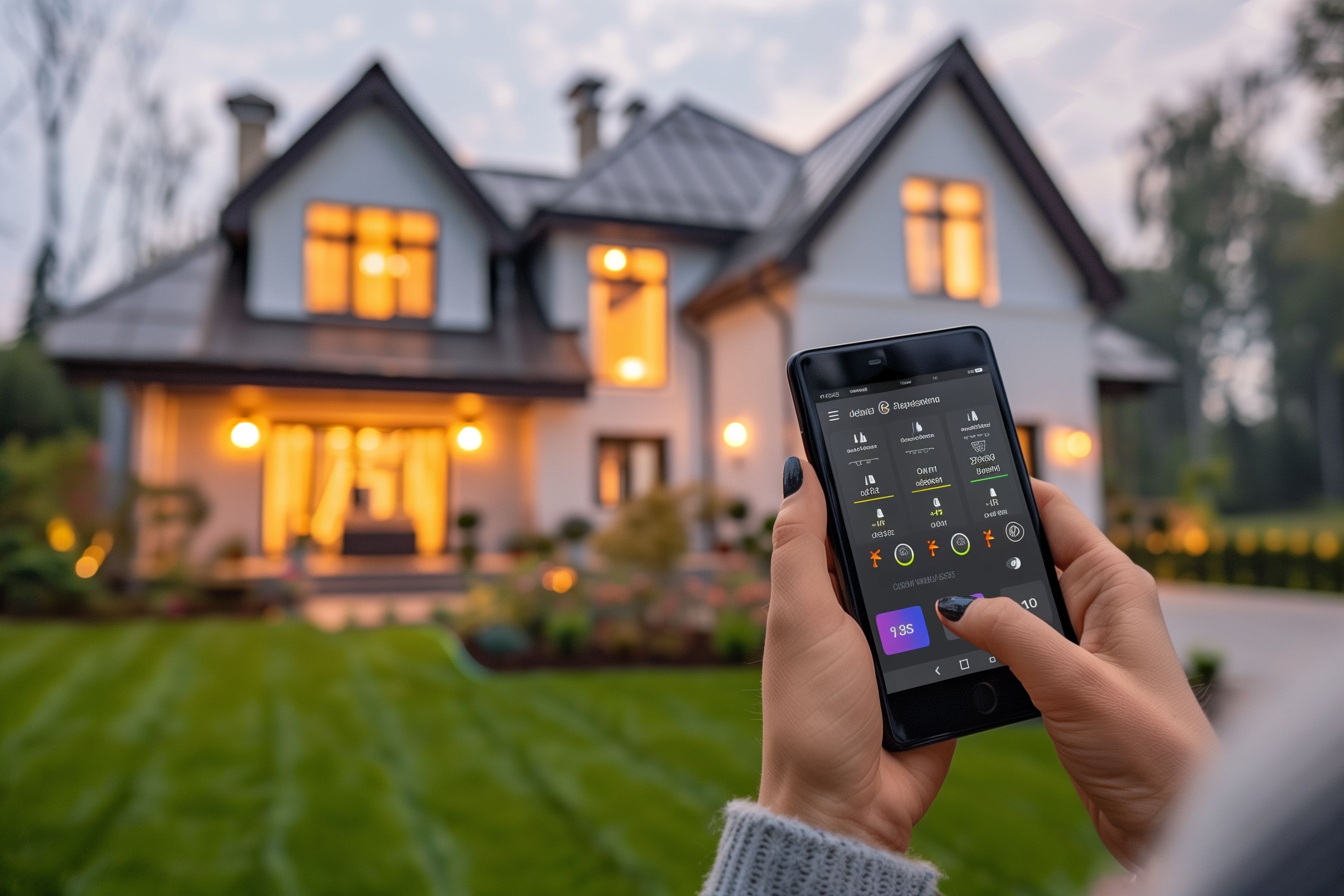 Dieses Foto zeigt eine moderne Abendansicht eines luxuriösen Landhauses mit Blick auf den beleuchteten Garten und den Außenbereich. Im Vordergrund hält eine Hand ein Smartphone, auf dem eine Smart-Home-Steuerungsapp zu sehen ist. Die Bildkomposition stellt einen Kontrast zwischen der hochwertigen Architektur des Hauses und der digitalen Technologie der Haussteuerung dar. Das Foto vermittelt den Eindruck von Komfort, Effizienz und Moderne und wäre ideal für die Verwendung in Blogs, Newslettern oder Social-Media-Beiträgen zum Thema Smart Home, Hausautomation oder Luxusimmobilien. Dieses kostenlose Stockfoto in hoher Auflösung steht unter einer Creative-Commons-Lizenz zur Verfügung.