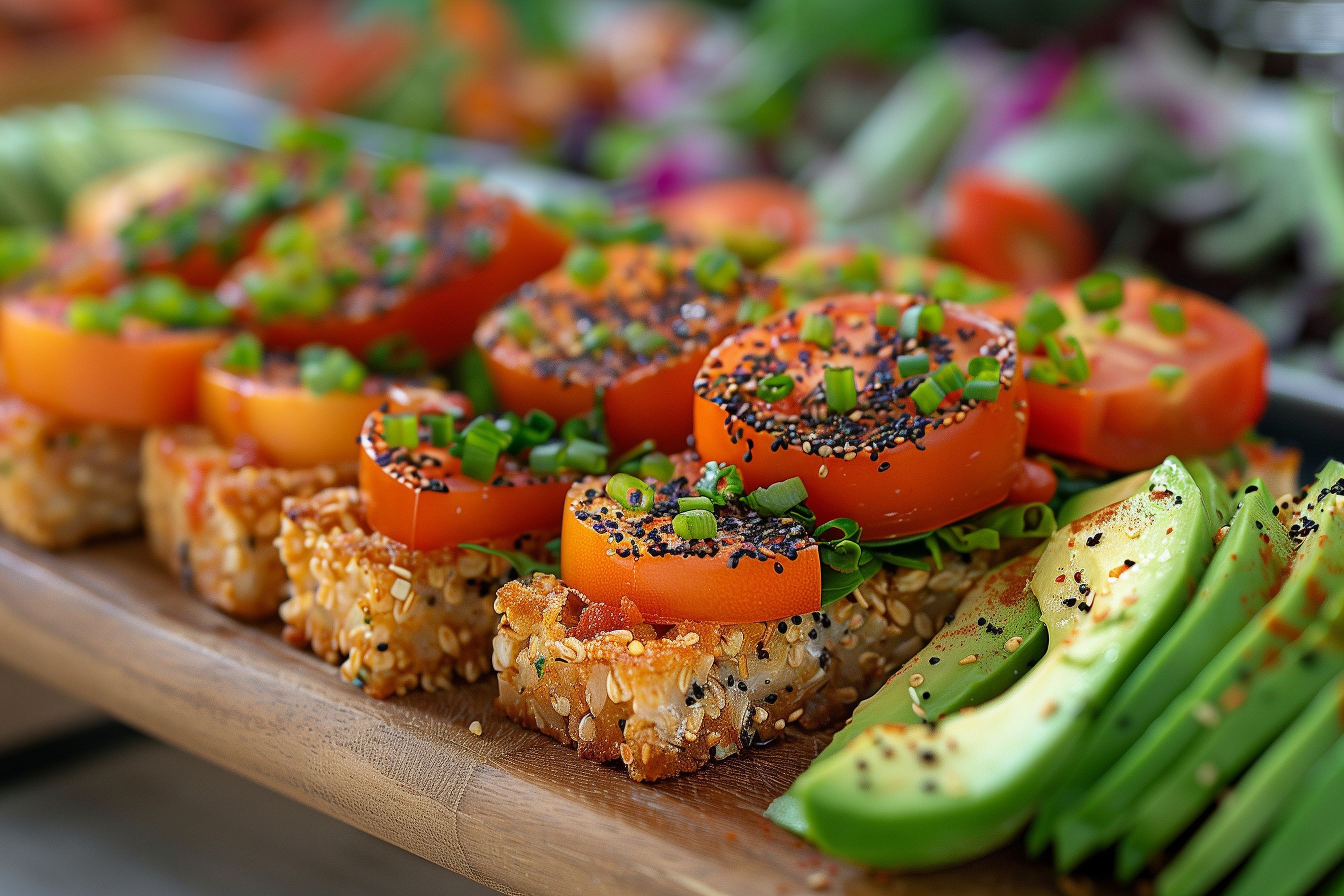 Das Bild zeigt einen leckeren Gemüse-Snack, angerichtet auf einem Holzbrett. Die Komposition ist sehr stilvoll und ästhetisch, mit verschiedenen bunten Zutaten wie Paprikastücke, die mit Gewürzen und grünen Kräutern garniert sind. Die Nahaufnahme ermöglicht einen detaillierten Blick auf die köstlichen Zutaten und das Arrangement, das zum Genießen und Nachkochen einlädt.