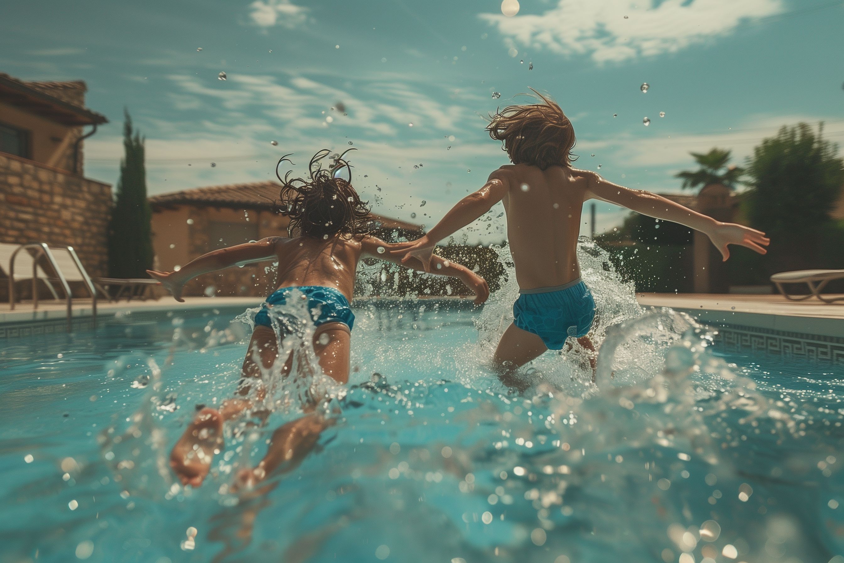 Das Bild zeigt zwei junge Menschen, die fröhlich im Schwimmbecken planschen und herumtollen. Die Szene ist voller Bewegung und Energie, die von den spritzendem Wasser und den wild fliegenden Haaren der Personen verstärkt wird. Die warmen, sonnigen Farben und die idyllische Umgebung mit Palmen und einem Gebäude im Hintergrund vermitteln ein Gefühl von Sommerferien und Entspannung. Das Foto eignet sich hervorragend für die Verwendung in Blogbeiträgen, Newslettern, Social-Media-Beiträgen oder Werbematerialien rund um Themen wie Reisen, Freizeit, Lifestyle oder Sommerstimmung. Als kostenloses Stockfoto in hoher Auflösung unter Creative-Commons-Lizenz kann es frei und vielfältig eingesetzt werden.