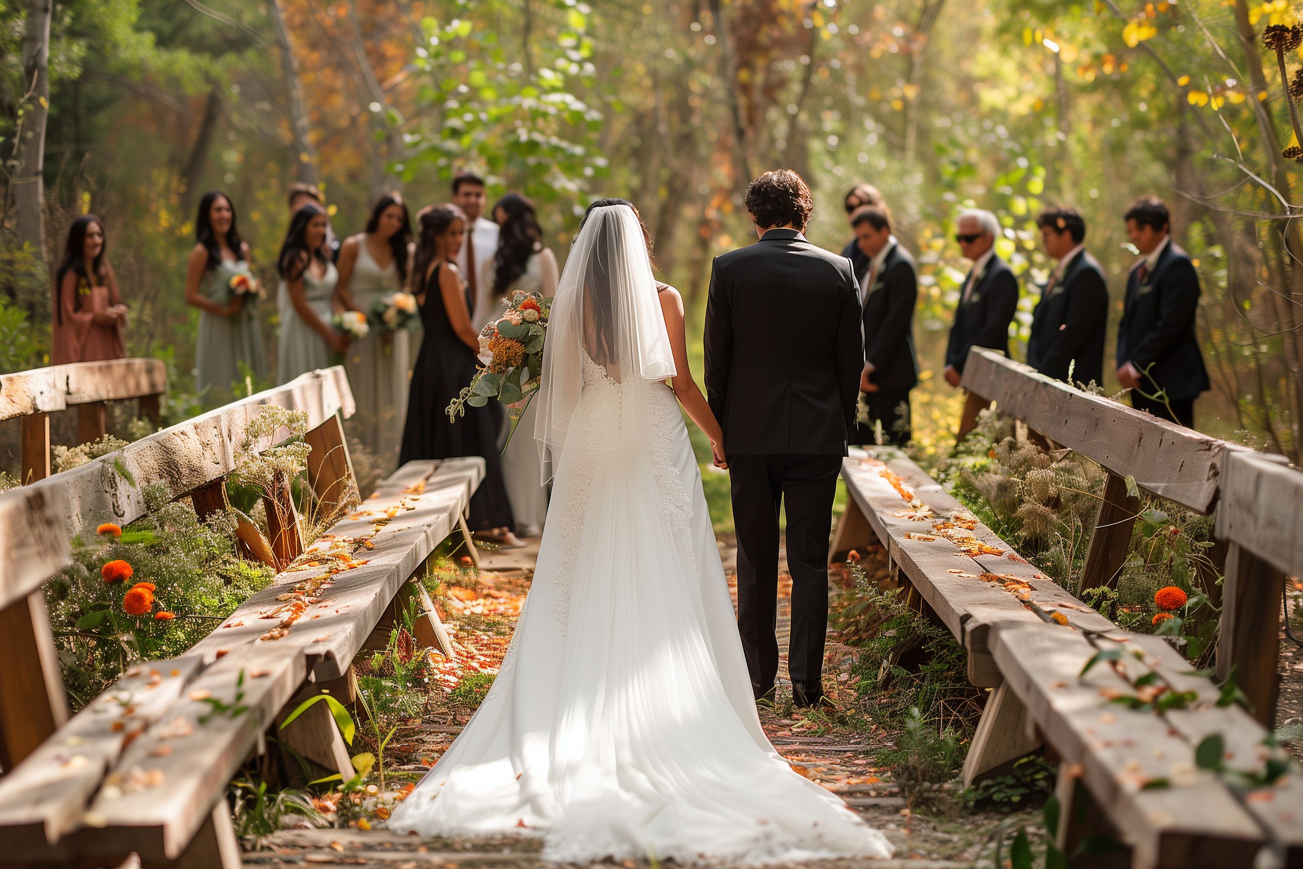 Das Foto zeigt eine romantische Hochzeitstrauung in einem herbstlichen Wald. Im Vordergrund sind das Brautpaar zu sehen, wie sie hand in hand auf einem Holzsteg stehen. Hinter ihnen ist die Hochzeitsgesellschaft - Brautjungfern in eleganten Kleidern und Anzugträger - versammelt. Die Szene ist von goldenen Herbstfarben, herunterfallenden Blättern und einer natürlichen, waldigen Umgebung umgeben, was eine stimmungsvolle und malerische Atmosphäre schafft.