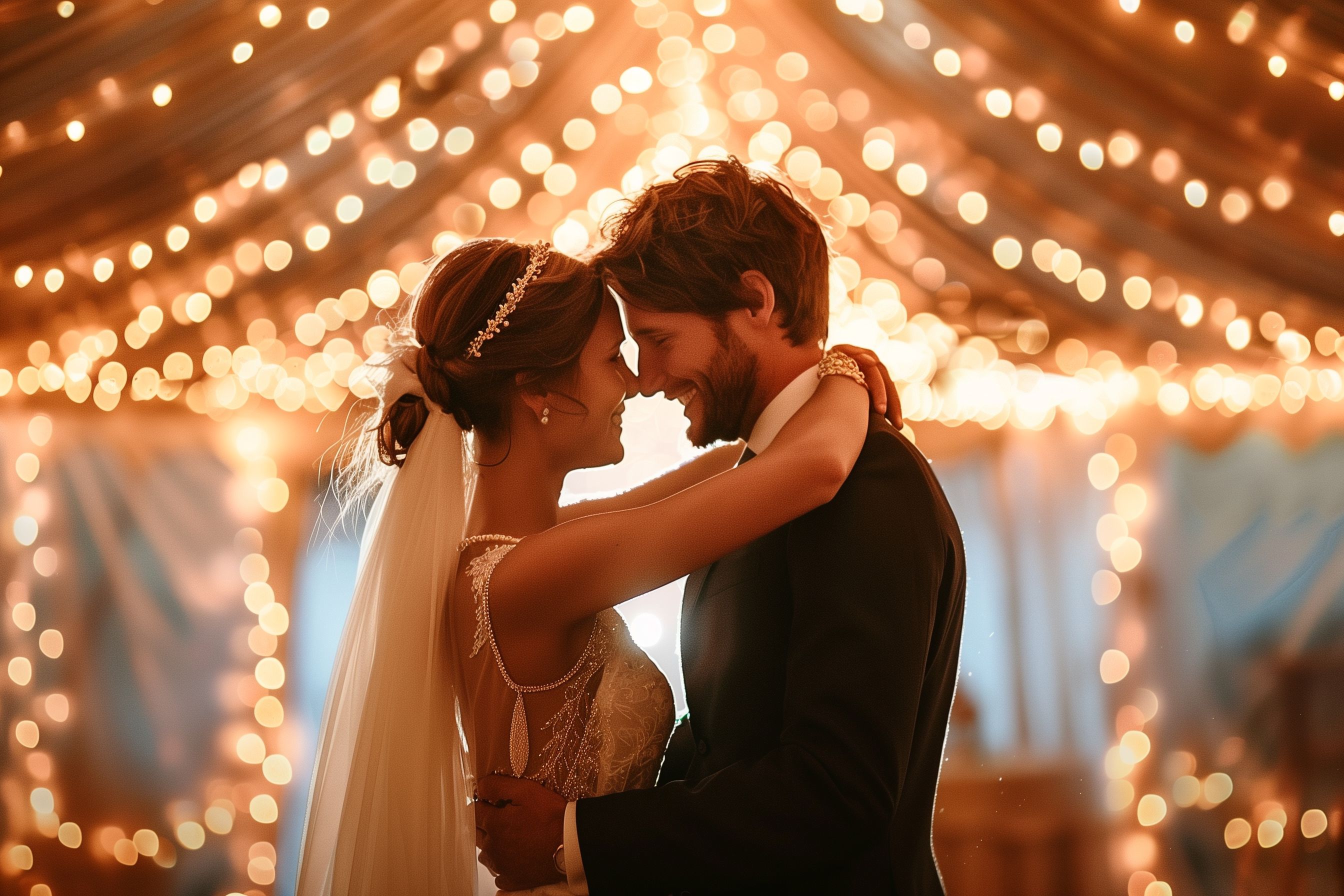 Das Foto zeigt ein verliebtes Brautpaar, das unter einer festlichen Lichterkette steht und einander liebevoll umarmt. Die Braut trägt ein weißes Brautkleid mit glitzernden Verzierungen, ihr Bräutigam ist in einen dunklen Anzug gekleidet. Durch die romantischen Lichterketten um sie herum entsteht eine warme, stimmungsvolle Atmosphäre. Das Bild wäre ideal für den Einsatz in Blogs, Hochzeitsportalen, Social-Media-Kanälen oder Werbekampagnen rund um das Thema Hochzeit. Als hochauflösendes, kostenloses Stockfoto unter einer Creative-Commons-Lizenz ist es frei nutzbar.