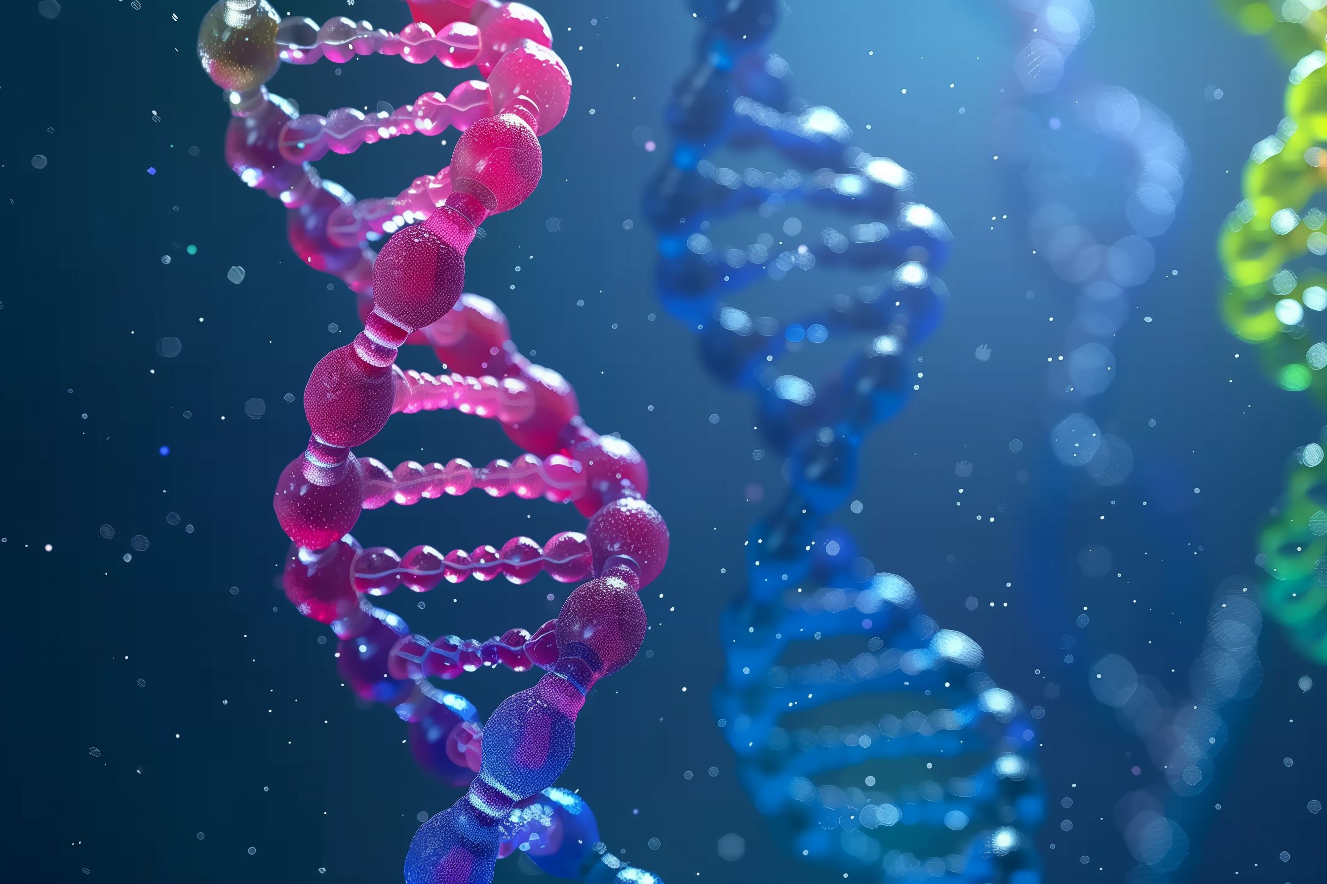 Das Bild zeigt eine leuchtende, spiralförmige DNA-Helix, die in einem Meer aus blauem und rosa Neonlicht eingetaucht ist. Die Helix ist detailliert dargestellt und wirkt fast dreidimensional, während der Hintergrund durch Unschärfe und Bokeh-Effekte eine abstrakte, farbenfrohe Atmosphäre schafft. Dieses Stockfoto eignet sich hervorragend für den Einsatz in Blogs, Newslettern, Social-Media-Beiträgen oder Werbematerialien rund um die Themen Genetik, Medizin, Wissenschaft und Technologie. Es ist in hoher Auflösung und unter einer Creative-Commons-Lizenz frei verwendbar.