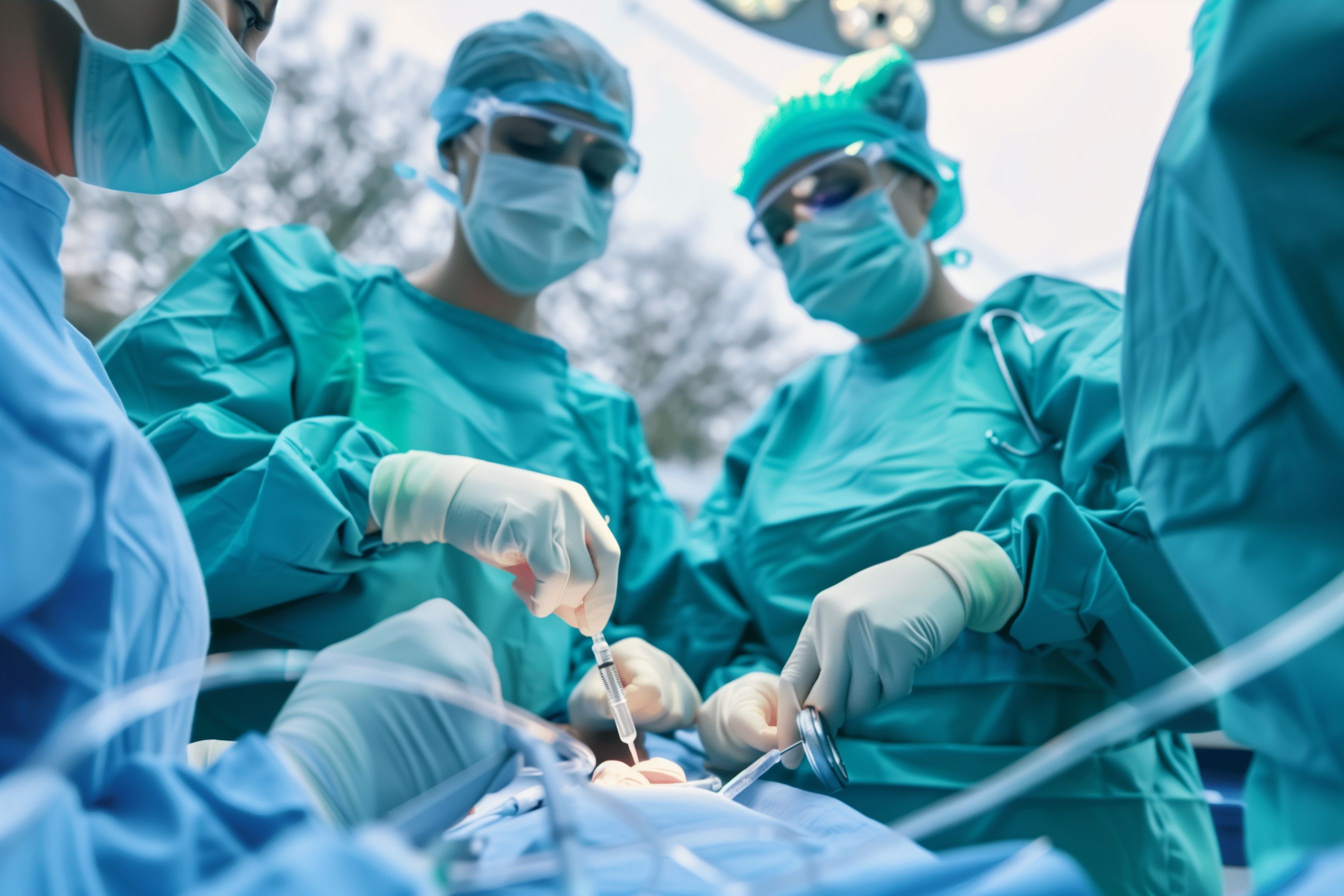 Das Foto zeigt drei Ärzte in grünen OP-Mänteln und Schutzmasken, die konzentriert an einer Patientin arbeiten. Sie halten verschiedene medizinische Instrumente in ihren Händen und sind in einen medizinischen Eingriff vertieft. Das Bild vermittelt den Eindruck von Professionalität, Konzentration und Teamwork im Gesundheitswesen. Es eignet sich hervorragend für den Einsatz in Blogs, Newslettern, sozialen Medien und Werbung im Bereich Medizin und Gesundheit. Dieses hochauflösende, kostenlose Stockfoto unter der Creative-Commons-Lizenz kann vielfältig genutzt werden.