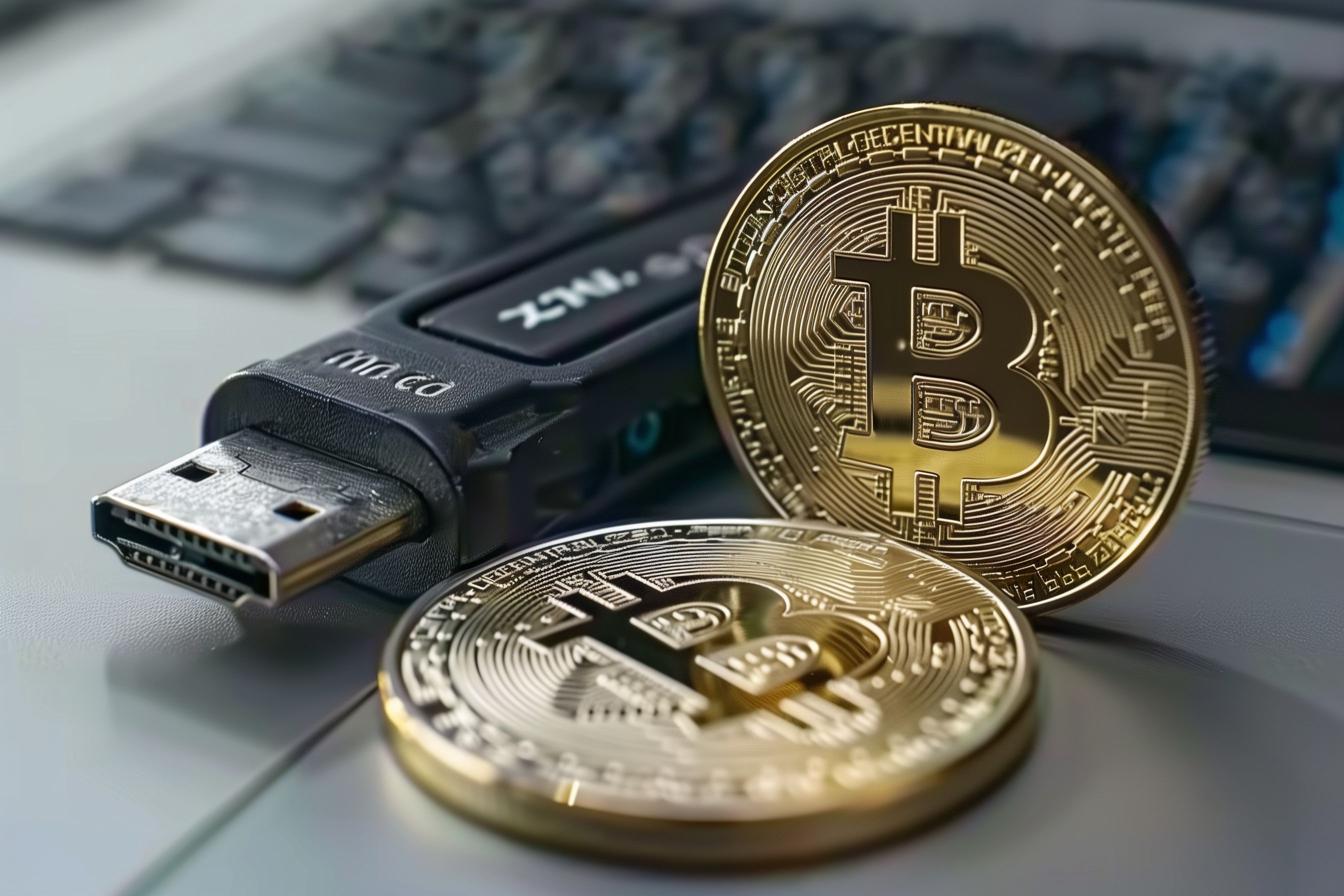 Das Bild zeigt eine Nahaufnahme von Bitcoins, einer digitalen Währung, die sich durch eine dezentralisierte Verwaltung und Blockchain-Technologie auszeichnet. Neben den Münzen ist auch eine USB-Stick-artige Hardware-Wallet zu sehen, die als sichere Aufbewahrungsmöglichkeit für Krypto-Vermögenswerte dient. Die Komposition legt den Fokus auf die beiden zentralen Elemente der digitalen Finanzwelt: die Kryptowährung selbst und die Möglichkeit, sie offline und geschützt aufzubewahren.