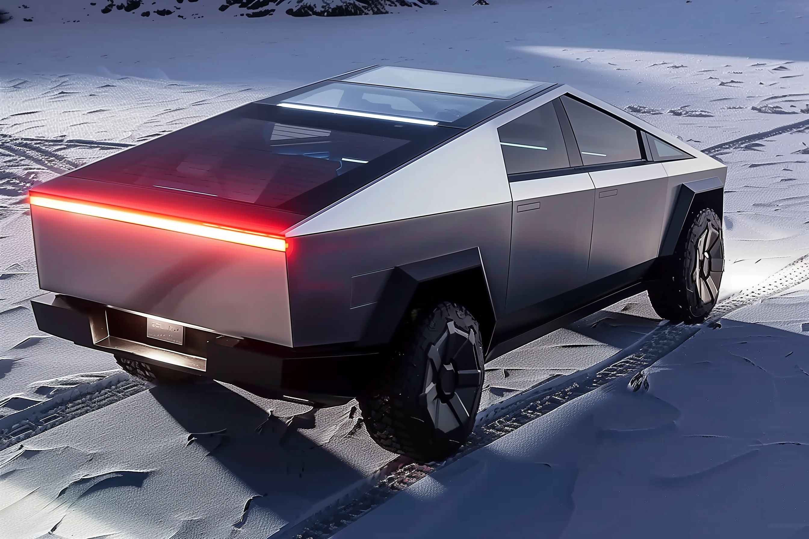 Das Bild zeigt ein futuristisches Elektro-SUV-Konzeptauto, das sich in einer verschneiten Landschaft befindet. Das Fahrzeug hat eine ungewöhnliche, kantige Formgebung mit auffallenden roten Akzenten an den Heckleuchten. Es scheint robust und für Offroad-Einsätze ausgelegt zu sein, passt aber gleichzeitig perfekt in die winterliche Umgebung. Die Komposition des Bildes legt den Fokus ganz auf das Fahrzeug, das wie eine Skulptur in der Schneelandschaft platziert wurde. Dieses Foto eignet sich hervorragend als kostenloses Stockfoto für Blogbeiträge, Werbekampagnen oder Social-Media-Postings rund um die Themen Elektromobilität, Zukunftstechnologie und moderne Automobildesigns in hoher Auflösung und unter einer Creative-Commons-Lizenz.