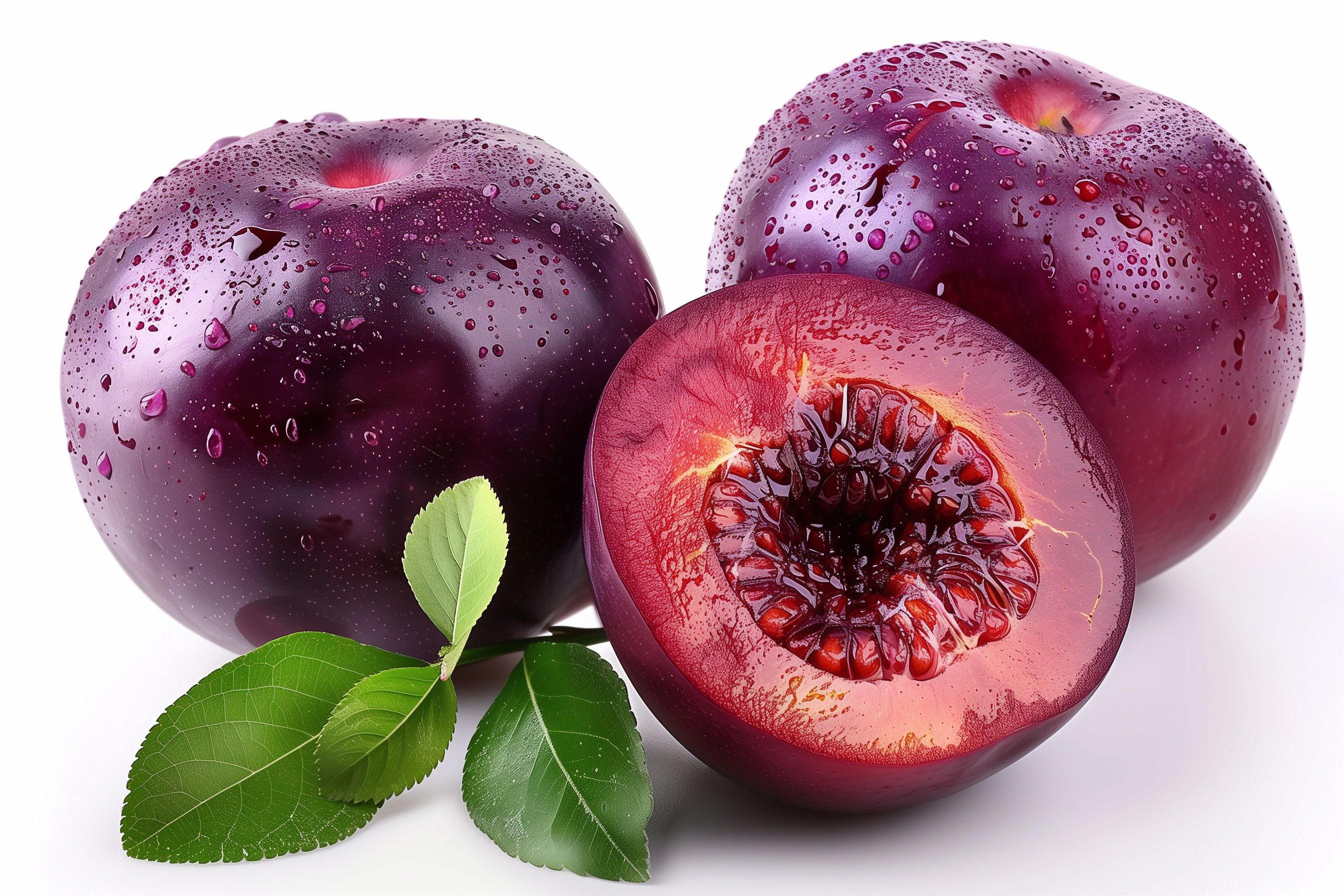 Das Foto zeigt mehrere saftige, lila Pflaumen mit Wassertropfen auf der Oberfläche. Die Früchte sind in einer klaren Nahaufnahme abgebildet, wodurch ihre intensive Farbe und Feuchtigkeit besonders hervorgehoben werden. Die Platzierung der Pflaumen im Bild ist harmonisch und fokussiert den Betrachter auf die Hauptmotive. Dieses Stockfoto eignet sich hervorragend für Beiträge in Blogs, Newsletters oder Social-Media-Kanälen zum Thema Obst, Lebensmittel, gesunde Ernährung oder Kulinarik. Es ist in hoher Auflösung verfügbar und unter einer Creative-Commons-Lizenz kostenlos nutzbar.