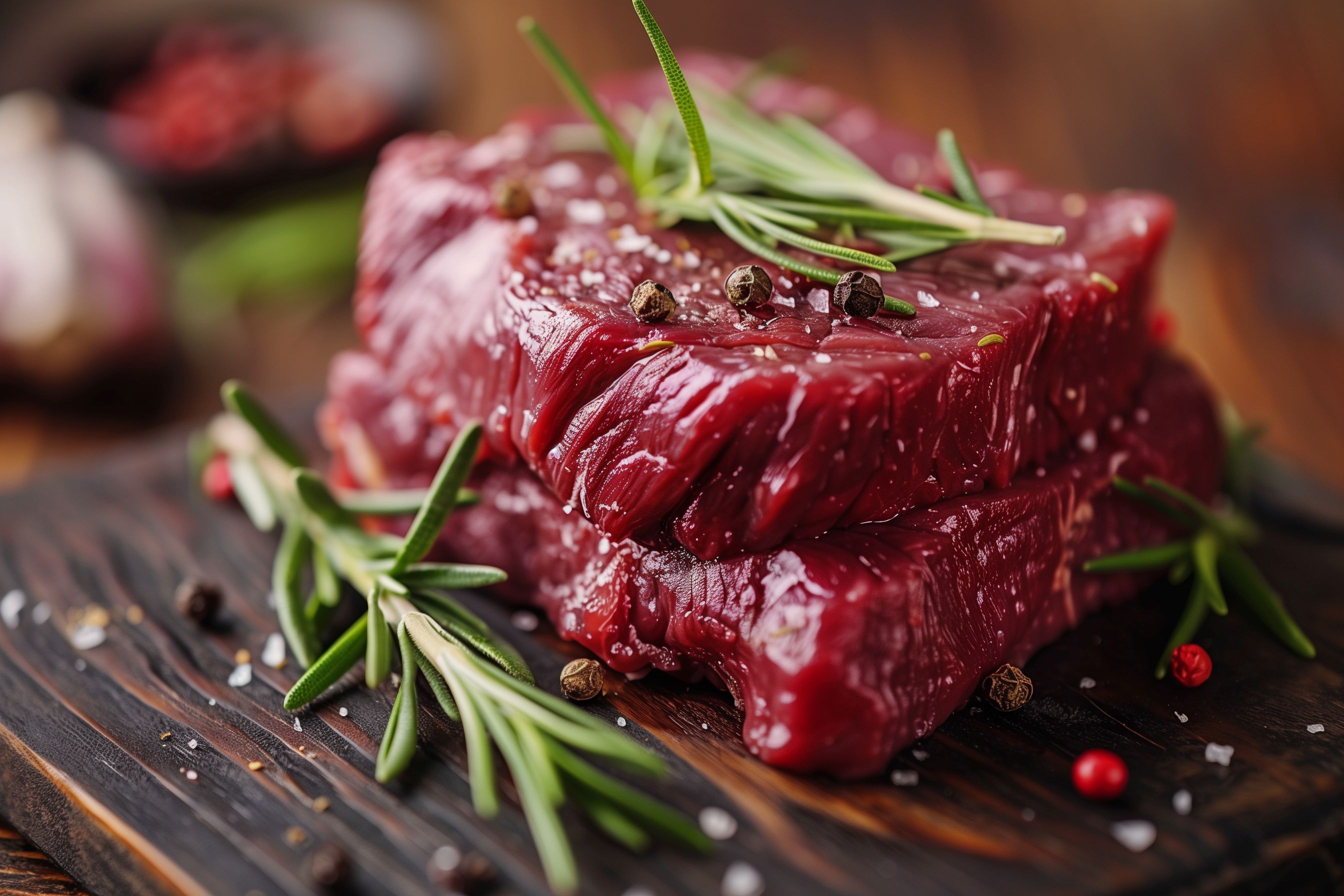 Das Bild zeigt ein würziges, marmoriertes Rindfleischstück auf einem rustikalen Holzbrett. Das Fleisch ist dunkelrot und weist eine schöne Fettmarmorierung auf. Dazu wurden frische Rosmarin-Zweige und ganze Pfefferkörner als Dekoration platziert, die dem Motiv eine natürliche, appetitanregende Note verleihen.
