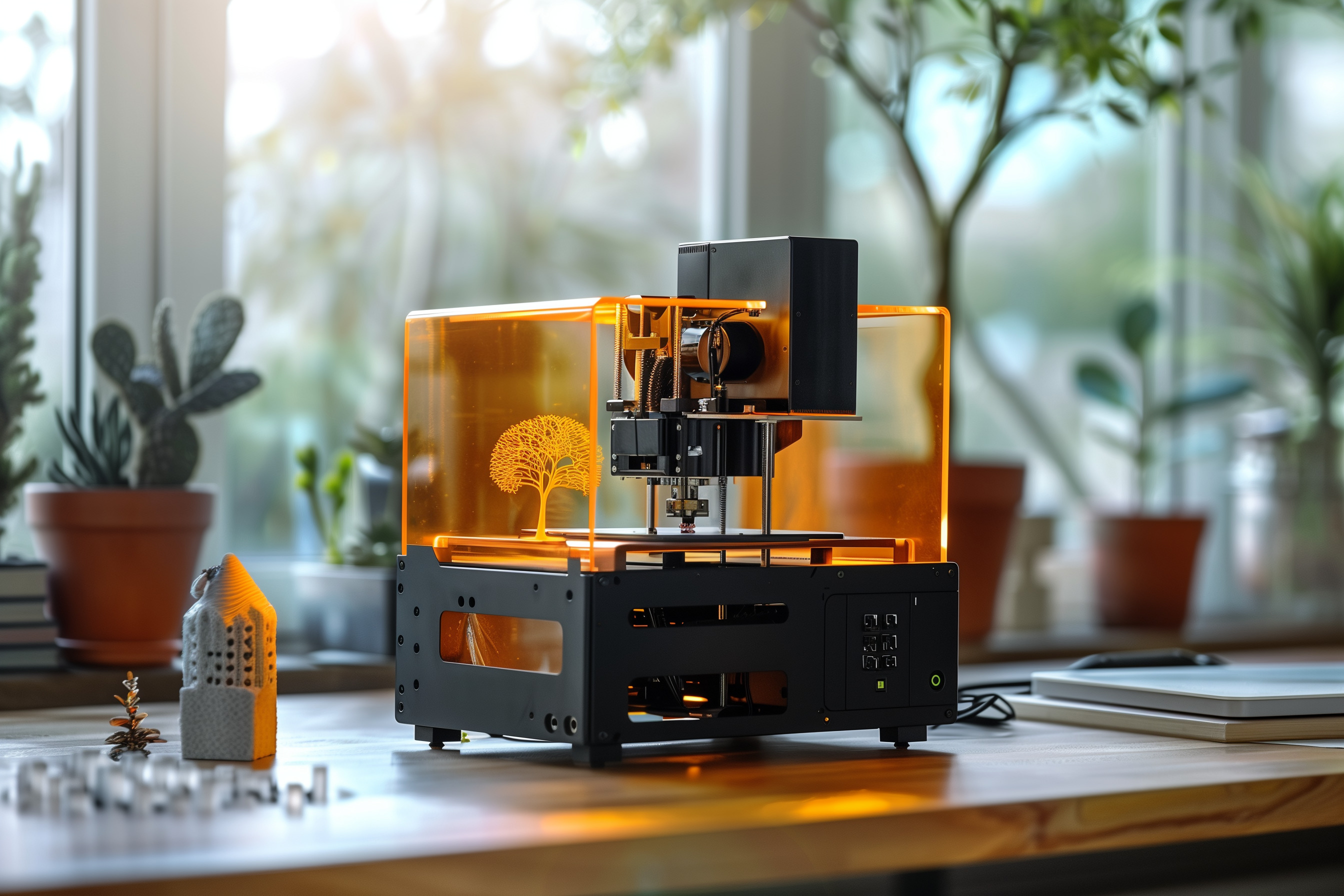 Dieses Foto zeigt einen modernen 3D-Drucker vor einem hellen, grünen Hintergrund mit Zimmerpflanzen. Der Drucker selbst ist in einem leuchtenden Orange gehalten und steht auf einem Holztisch, umgeben von weiteren Accessoires wie einem 3D-gedruckten Objekt und einem Smartphone. Die Draufsicht-Perspektive und die pastellfarbene Farbpalette verleihen dem Bild einen minimalistischen, stylischen Look, der sich perfekt für Blogbeiträge, Social-Media-Posts oder Werbeflyer eignet.