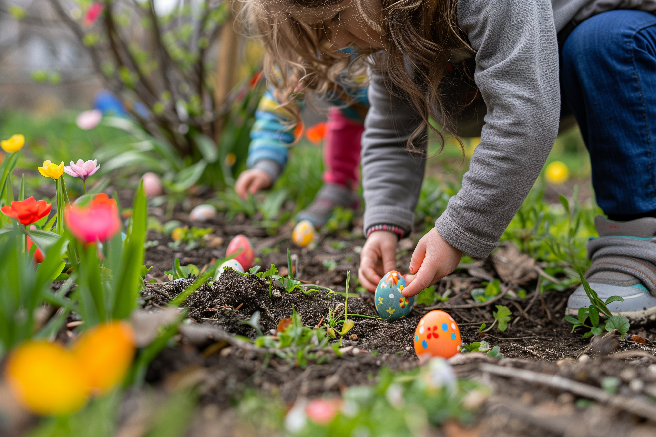 Das Bild zeigt eine Person, die bunte Ostereier in einem blühenden Garten versteckt. Der Fokus liegt auf den Händen, die die Eier in den Boden eingraben. Im Hintergrund sind bunte Tulpen und andere Frühlingsblumen zu sehen, die dem Bild eine farbenfrohe Atmosphäre verleihen. Dieses kostenloses Stockfoto in hoher Auflösung unter Creative-Commons-Lizenz eignet sich hervorragend für Beiträge in Blogs, Newsletter, Social-Media-Kanälen oder Werbematerialien rund um das Thema Ostern, Frühling und Gartenarbeit.