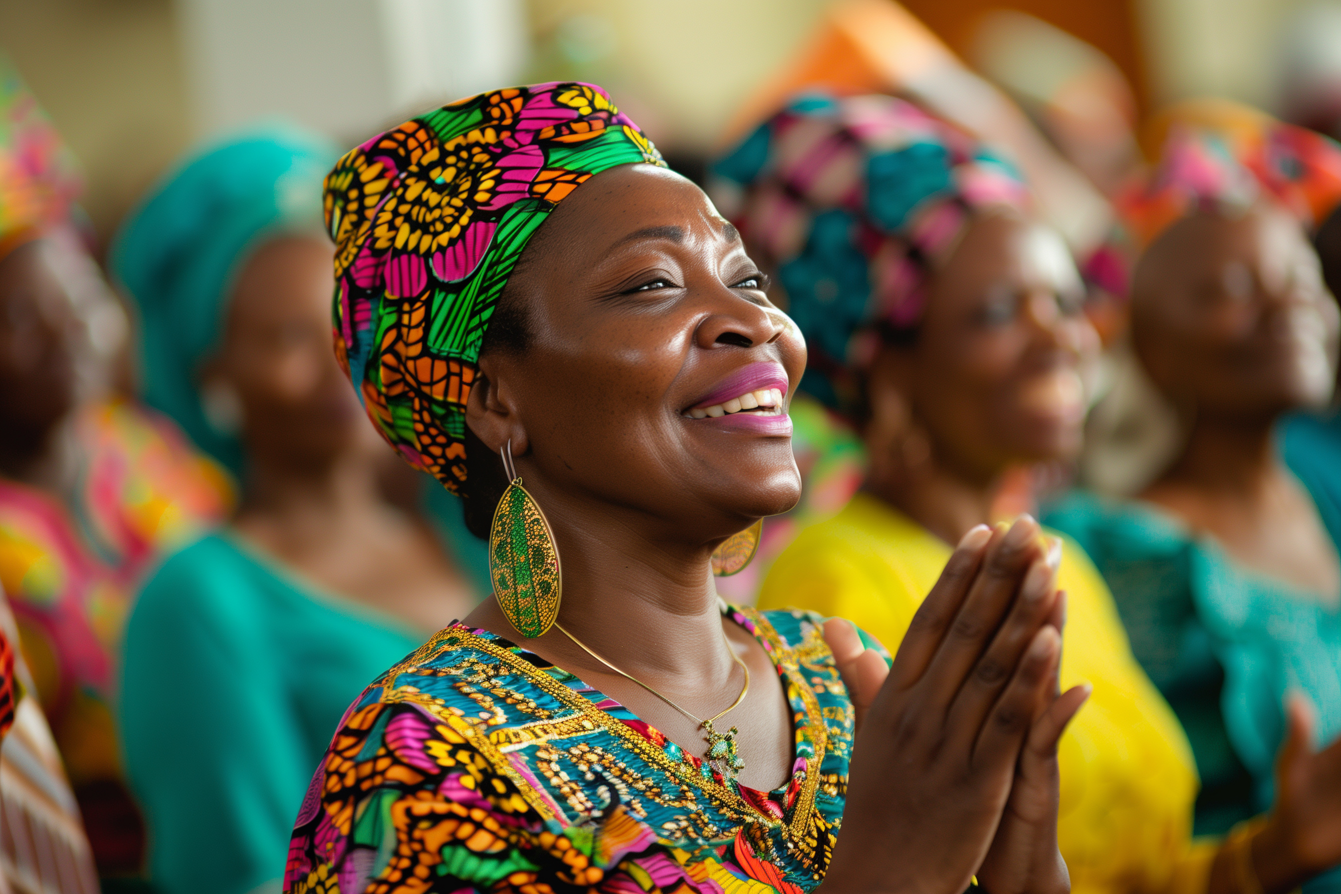Das Bild zeigt eine Frau in leuchtender, traditioneller afrikanischer Kleidung. Sie trägt einen bunten Kopfschmuck und Ohrringe, und ihr Gesichtsausdruck strahlt Freude und Zufriedenheit aus. Die Komposition des Fotos konzentriert sich auf ihr Gesicht und ihre Oberkörper, wobei der Hintergrund unscharf bleibt, was den Fokus auf die Frau lenkt.