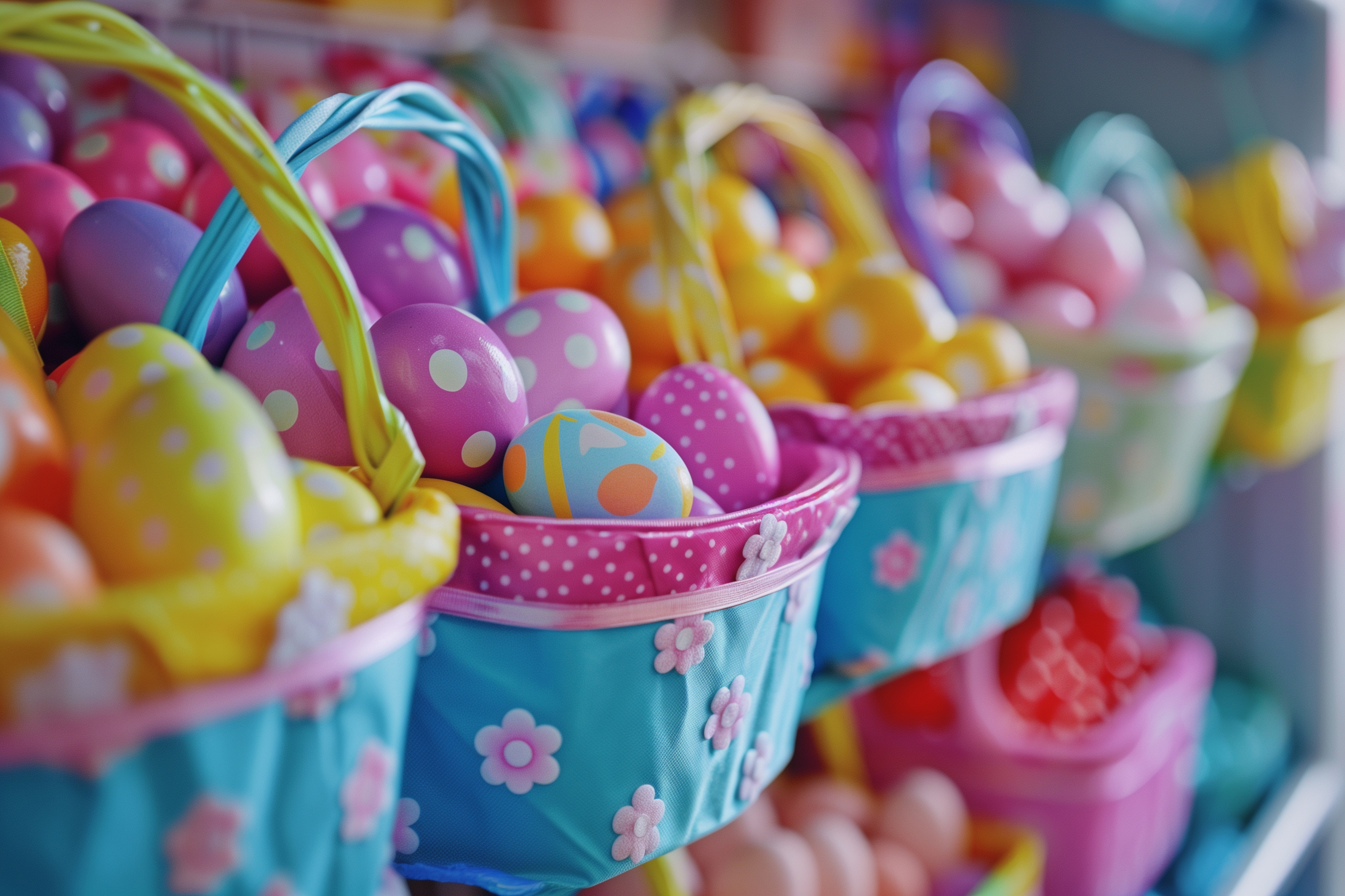 Das Bild zeigt eine Vielzahl bunter Ostereier in unterschiedlichen Pastellfarben und Punktmustern, die in dekorativen Körben mit Blumenmotiven angeordnet sind. Die farbenfrohe Komposition vermittelt eine heitere, festliche Stimmung und lässt an Osterfeiern und Traditionen denken. Dieses kostenlose Stockfoto in hoher Auflösung unter Creative-Commons-Lizenz eignet sich hervorragend für die Verwendung in Blogs, Newslettern, Social-Media-Beiträgen und Werbematerialien rund um Ostern und den Frühling.