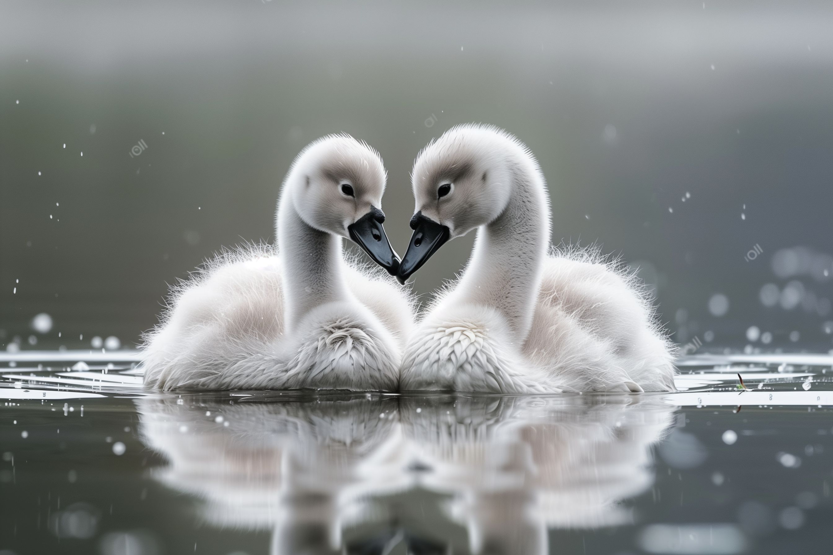 Das Bild zeigt zwei junge, flauschige Schwäne, die sich liebevoll mit den Schnäbeln berühren, während sie auf einem ruhigen See schwimmen. Die Szene ist in stimmungsvollen Grautönen gehalten, die eine friedliche und romantische Atmosphäre schaffen. Die Spiegelung der Vögel im Wasser verstärkt den minimalistischen und harmonischen Eindruck. Dieses kostenlose Stockfoto in hoher Auflösung eignet sich hervorragend für den Einsatz in Blogs, Newslettern, Social-Media-Beiträgen oder Werbekampagnen, die eine natürliche, idyllische und emotionale Stimmung vermitteln möchten. Es steht unter einer Creative-Commons-Lizenz zur Verfügung.