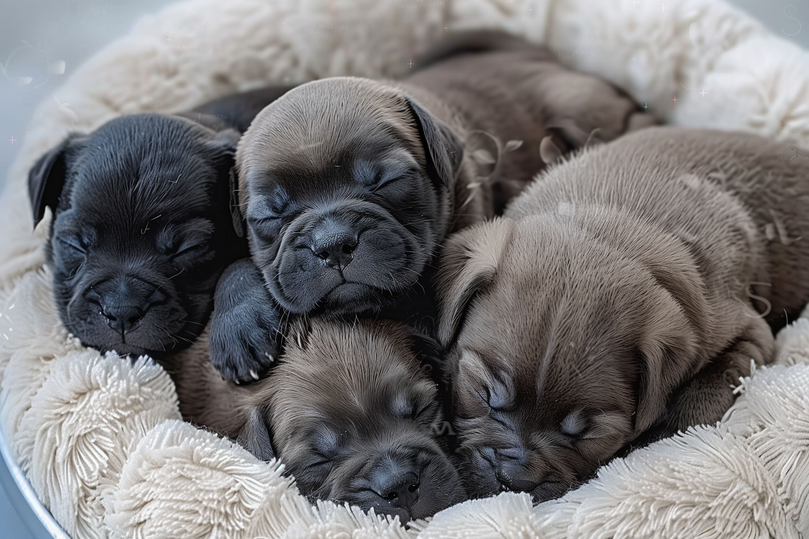 Das Bild zeigt eine Gruppe von schlafenden Hundewelpen, die in eine flauschige, graue Decke eingerollt sind. Die Welpen liegen eng beieinander und sind allem Anschein nach in einem tiefen, friedlichen Schlaf versunken. Die Perspektive ist nah an den Tieren, was den Eindruck von Wärme und Geborgenheit verstärkt. Das Bild eignet sich hervorragend als kostenloses Stockfoto für Blog-Beiträge, Newslettergestaltung, Social-Media-Posts oder Werbematerialien rund um Haustiere, Familie und Gemütlichkeit. Die hohe Auflösung des Fotos erlaubt eine flexible Nutzung unter Creative-Commons-Lizenz.