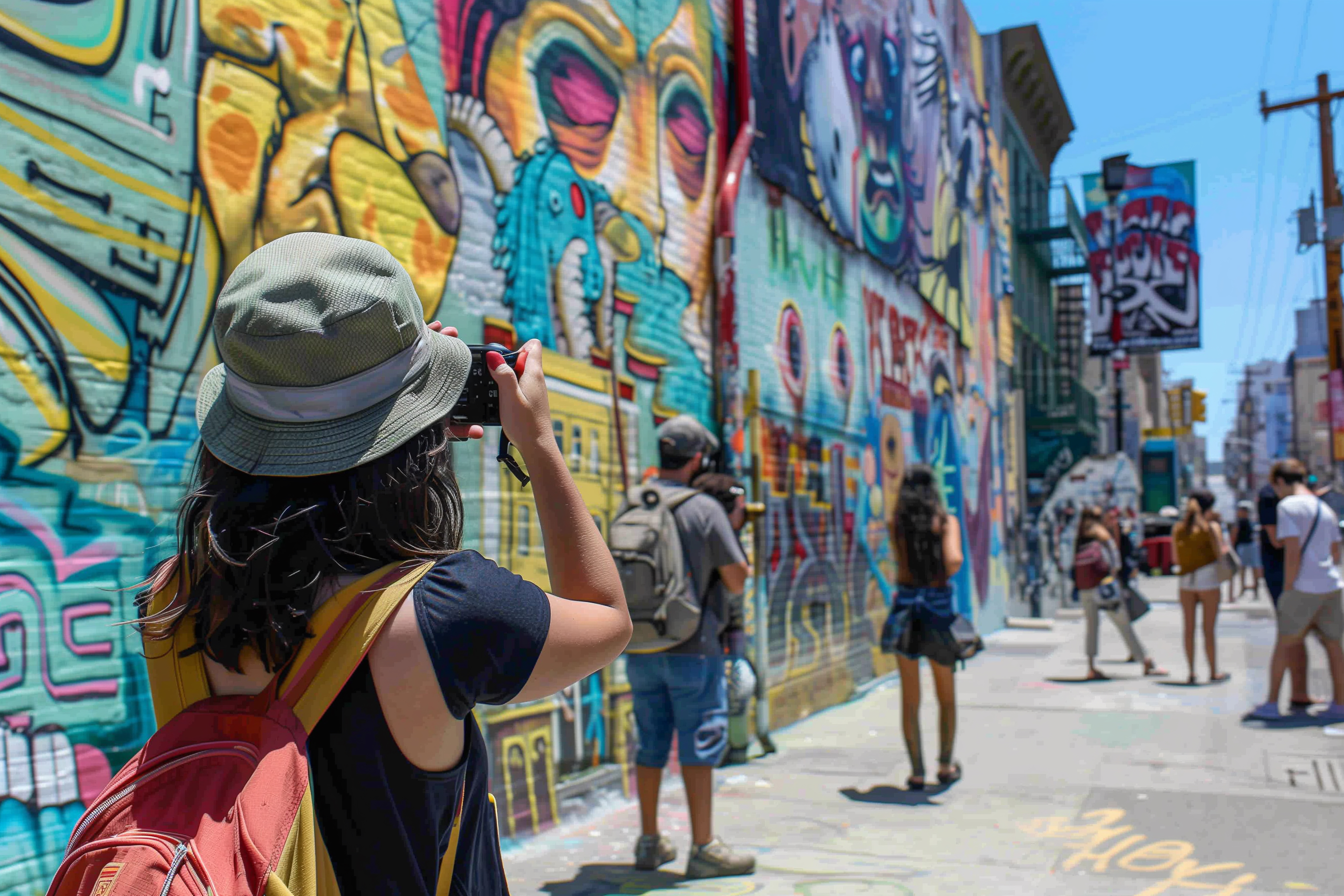 Das Bild zeigt eine Wand voller bunter Graffiti-Kunst in einer belebten Großstadt. Eine junge Frau mit Hut und Rucksack fotografiert die farbenfrohe Wand, während andere Passanten die Straße entlanggehen. Die Perspektive des Fotos ermöglicht es, den Kontrast zwischen der lebendigen, kreativen Wandgestaltung und der urbanen Umgebung einzufangen. Dieses Stockfoto eignet sich hervorragend für Blog-Beiträge, Social-Media-Postings oder Werbekampagnen, die einen modernen, jugendlichen Stil vermitteln wollen. Das hochauflösende Bild ist als kostenloses Stockfoto unter Creative-Commons-Lizenz verfügbar.