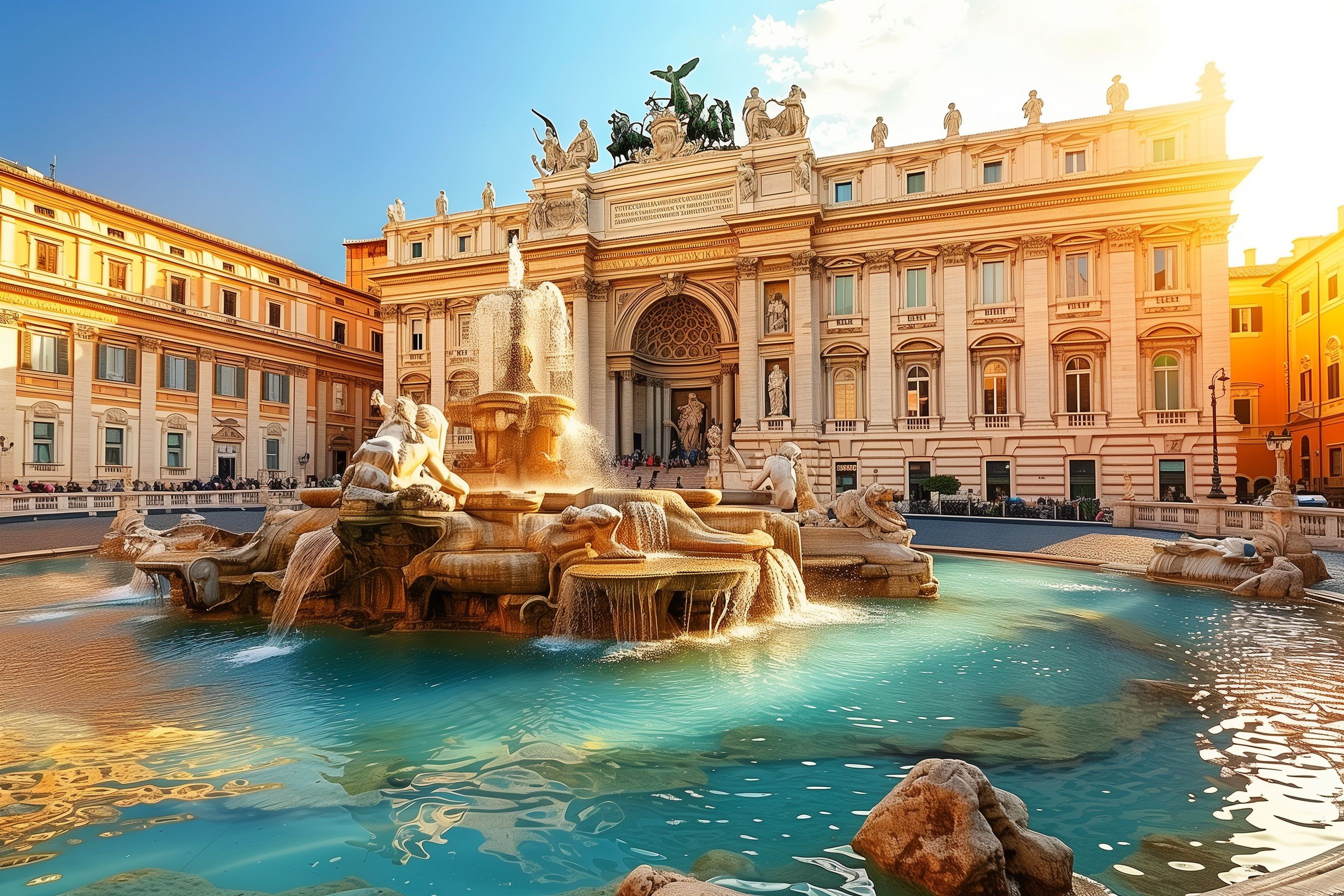 Das Bild zeigt einen prächtigen Brunnen vor einer beeindruckenden barocken Fassade in Rom. Der Brunnen ist von einer Reihe monumentaler Statuen umgeben, die über dem Wasserbecken thronen. Das Sonnenlicht taucht die Szene in ein warmes, goldenes Licht und lässt den Brunnen sowie die Fassade mit ihren Nischen und Säulen erstrahlen. Diese Aufnahme wäre ein ideales kostenloses Stockfoto für Beiträge über Reisen nach Italien, Architektur, Kunst und Kultur oder auch als Hintergrundbild in hoher Auflösung für Werbung und Social Media. Lizenziert unter Creative Commons, kann dieses Foto frei verwendet werden.