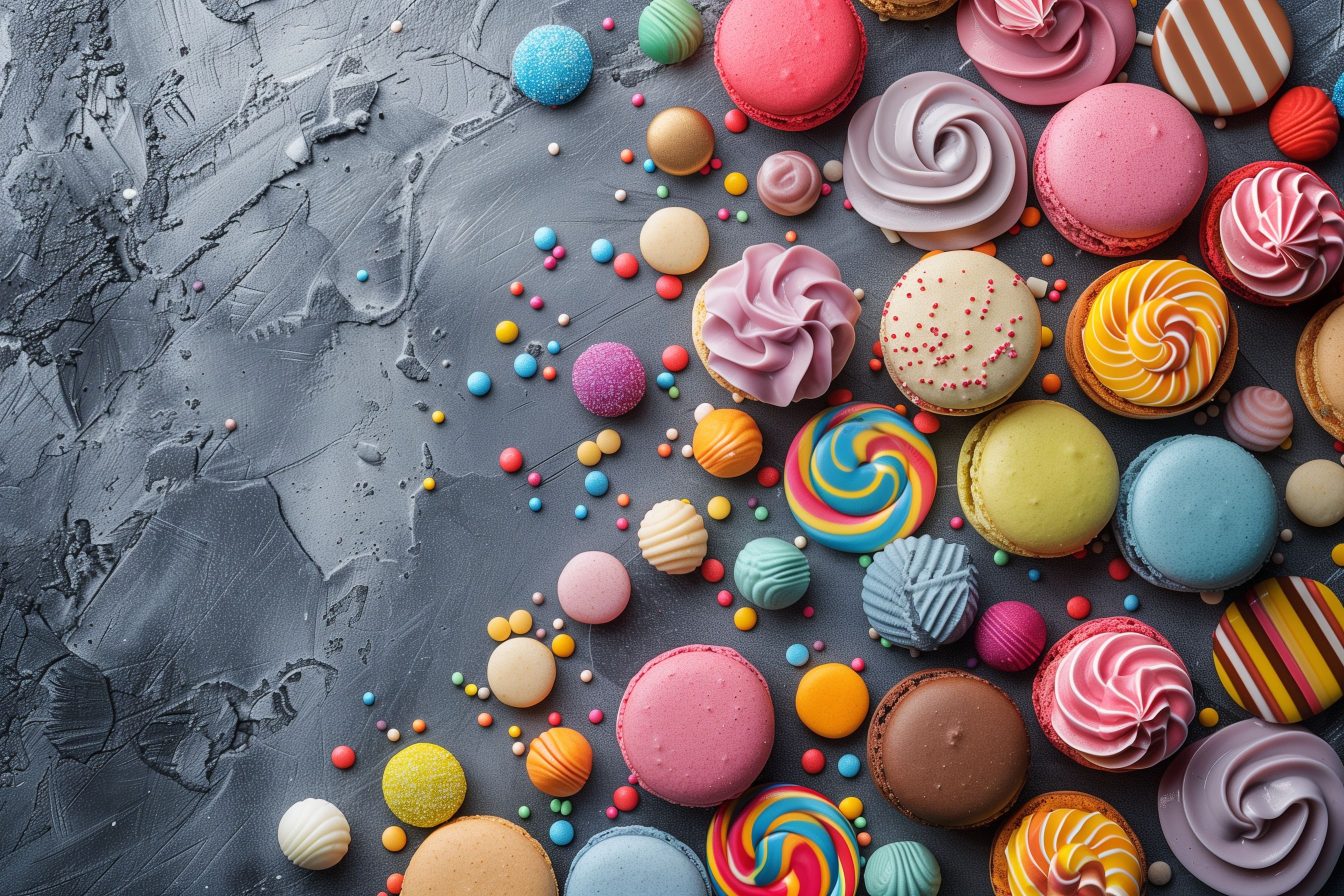 Das Bild zeigt eine bunte Anordnung verschiedener Süßigkeiten und Gebäckstücke auf einer grauen Betonoberfläche. Die Komposition ist farbenfroh und kreativ, mit Macarons, Cupcakes, Bonbons, Schokoladentafeln und anderen Leckereien in unterschiedlichen Pastellfarben und Formen. Durch den Kontrast zwischen den lebendigen Farben der Süßigkeiten und der schlichten, strukturierten Oberfläche entsteht eine interessante Optik. Dieses Stockfoto in hoher Auflösung eignet sich hervorragend für den Einsatz in Blogs, Newslettern, Social-Media-Kanälen und Werbematerialien. Als kostenloses Bild unter Creative-Commons-Lizenz kann es vielseitig genutzt werden.