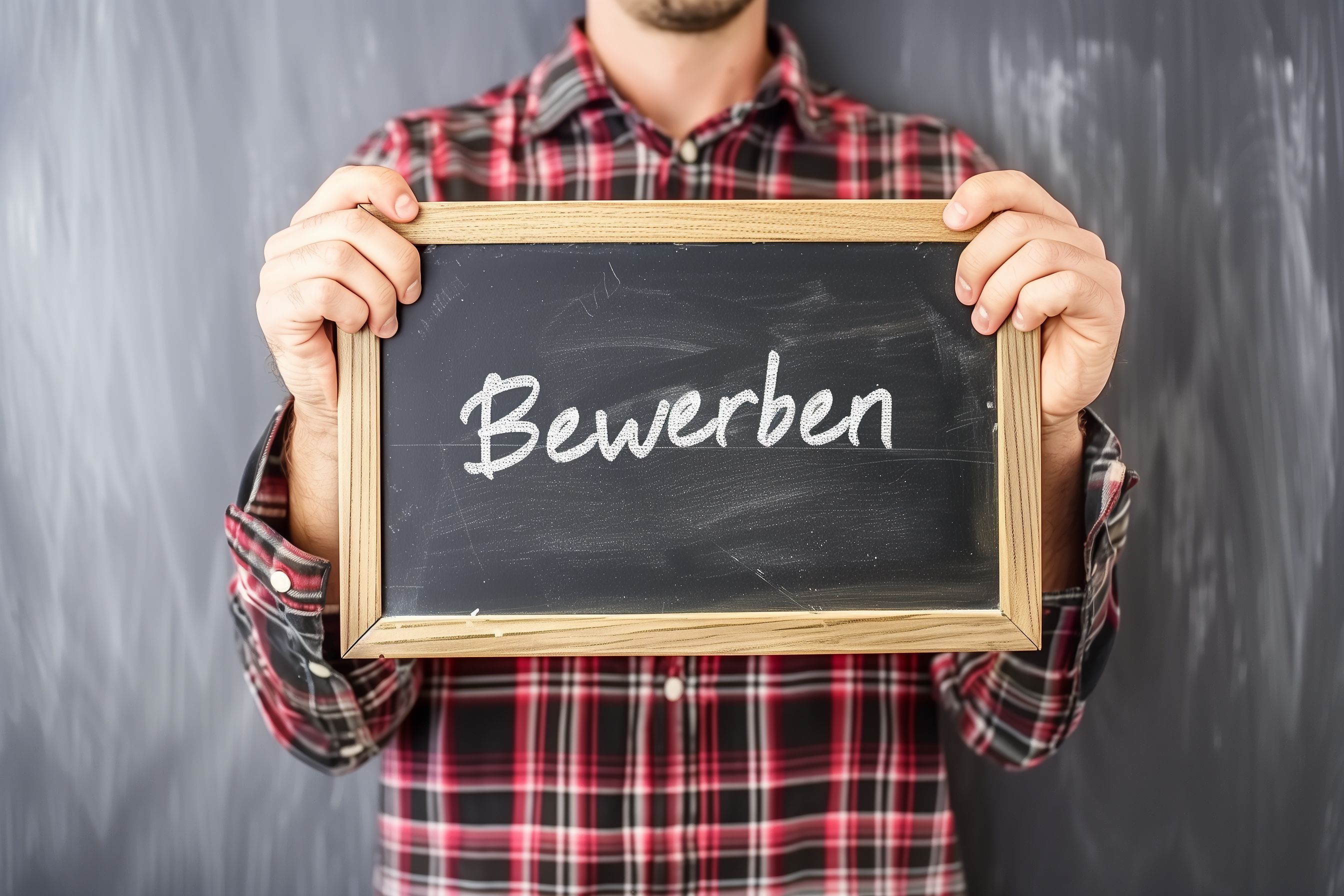 Das Foto zeigt eine Holztafel mit der handgeschriebenen Aufschrift 'Bewerben' in weißer Kreide. Der Rahmen ist aus Holz und verleiht dem Bild einen rustikalen Charme. Die Aufnahme ist in einer neutralen Umgebung mit grauem Hintergrund entstanden, wodurch der Fokus ganz auf der Botschaft der Tafel liegt.