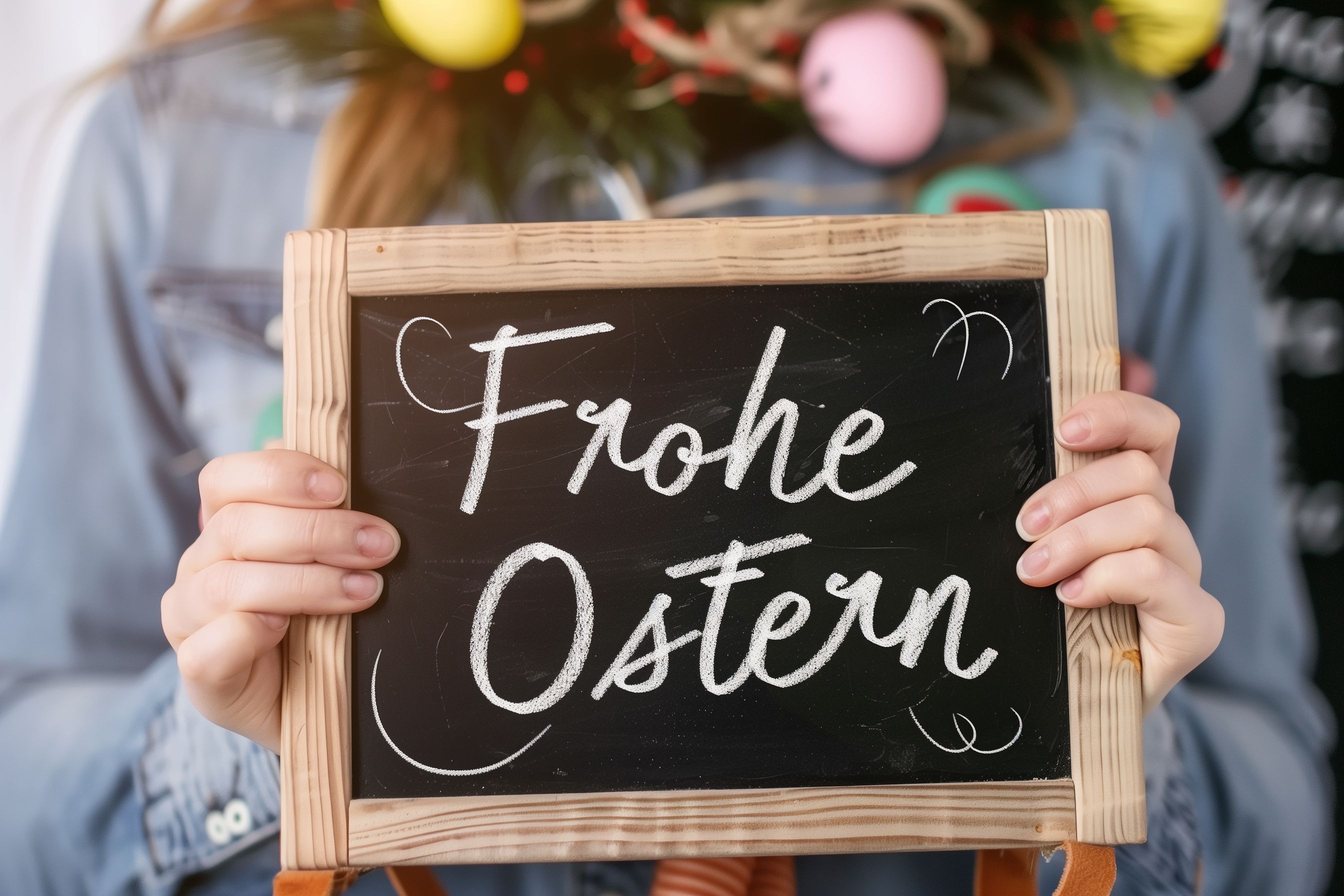 Das Bild zeigt eine Holztafel mit der Aufschrift 'Frohe Ostern' in Kreideschrift. Die Tafel ist vor einem Hintergrund mit Osterdekoration wie Blumen und Eiern platziert. Die Perspektive ist frontal, was den Fokus auf den Ostergruß legt. Die dunkle Tafel bildet einen schönen Kontrast zu den hellen Frühlingsfarben im Hintergrund. Dieses Foto lässt sich ideal als Grußkarte, Menükarte oder Werbemittel für Ostern einsetzen, sowohl digital als auch im Print. Als kostenloses, hochauflösendes Stockfoto unter Creative-Commons-Lizenz ist es für vielfältige Verwendungen geeignet.
