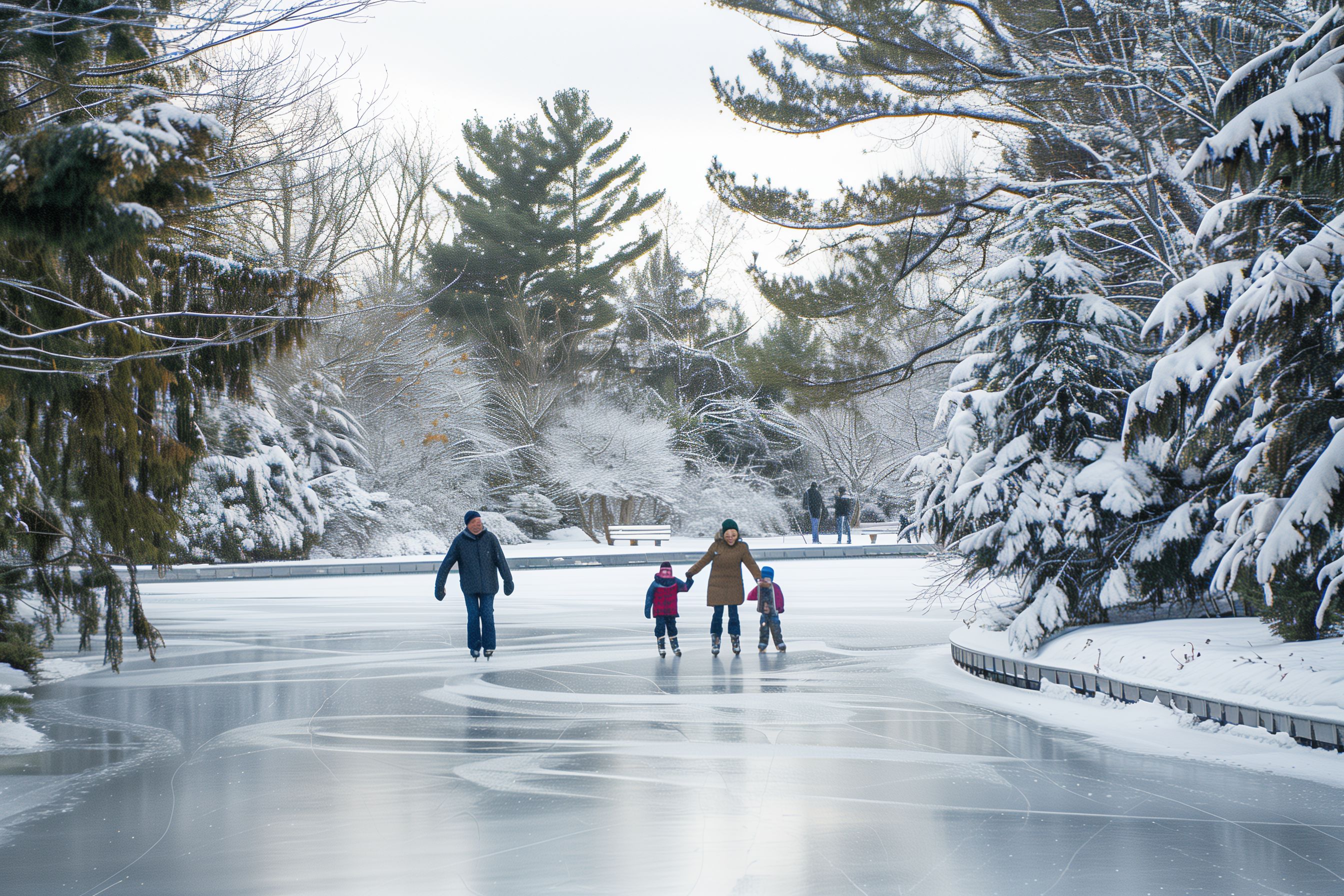 Das Foto zeigt eine idyllische Winterlandschaft. In einem verschneiten Wald befindet sich ein gefrorener See, auf dem eine vierköpfige Familie Schlittschuh läuft. Die Bäume sind mit Schnee bedeckt und verleihen der Szene eine zauberhaft-märchenhafte Atmosphäre. Die Familie ist warm eingepackt und scheint den Moment auf dem Eis sichtlich zu genießen.