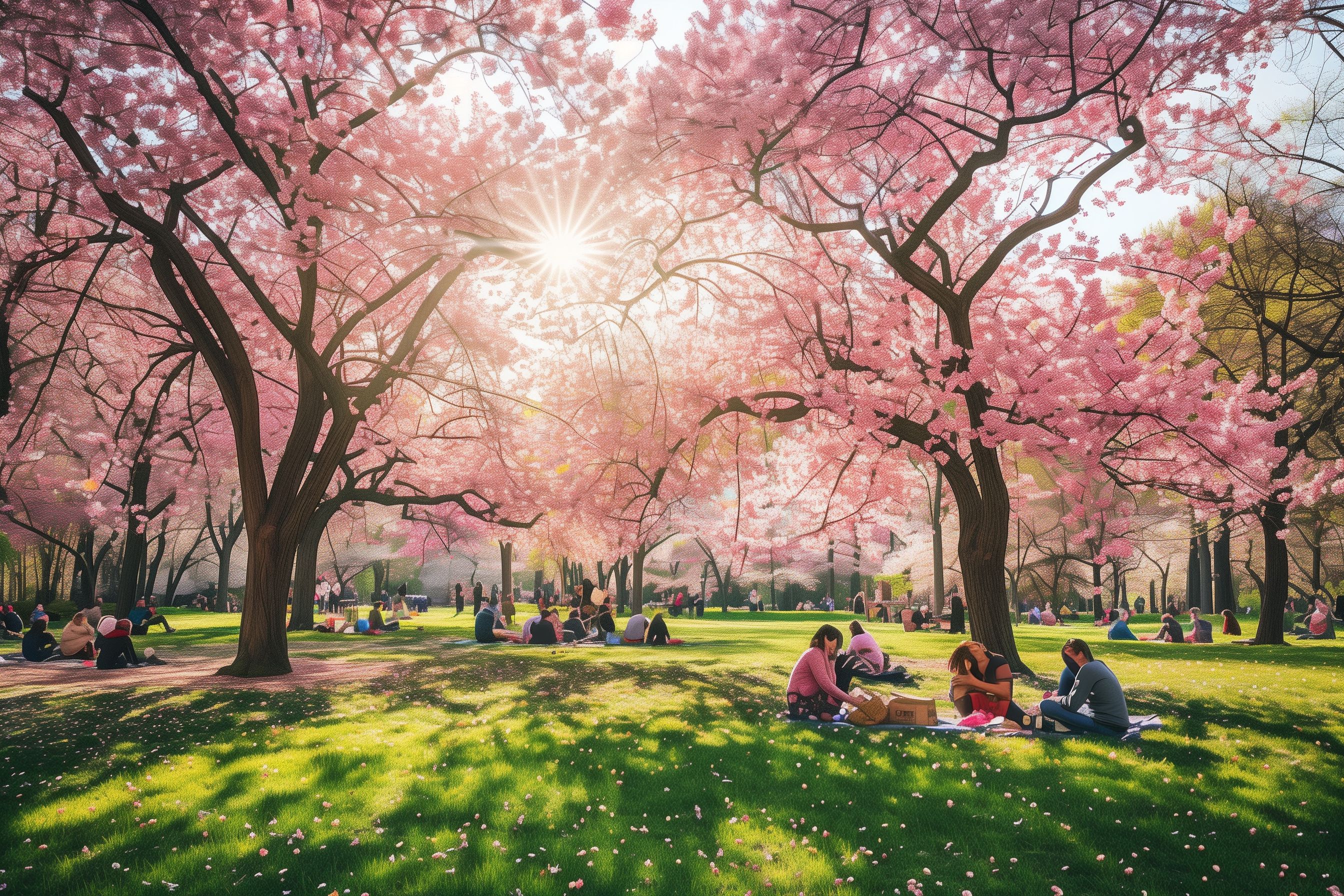 Dieses faszinierende Foto zeigt einen wunderschönen Kirschblütenpark an einem sonnigen Frühlingstag. Die rosa Blüten der Kirschbäume erfüllen die Szene mit einer Pracht und Lebendigkeit, die den Betrachter in eine zauberhaft friedliche Stimmung versetzt. Tief grünes Gras und ein blauer Himmel mit vereinzelten Sonnenstrahlen vervollständigen das idyllische Bild.