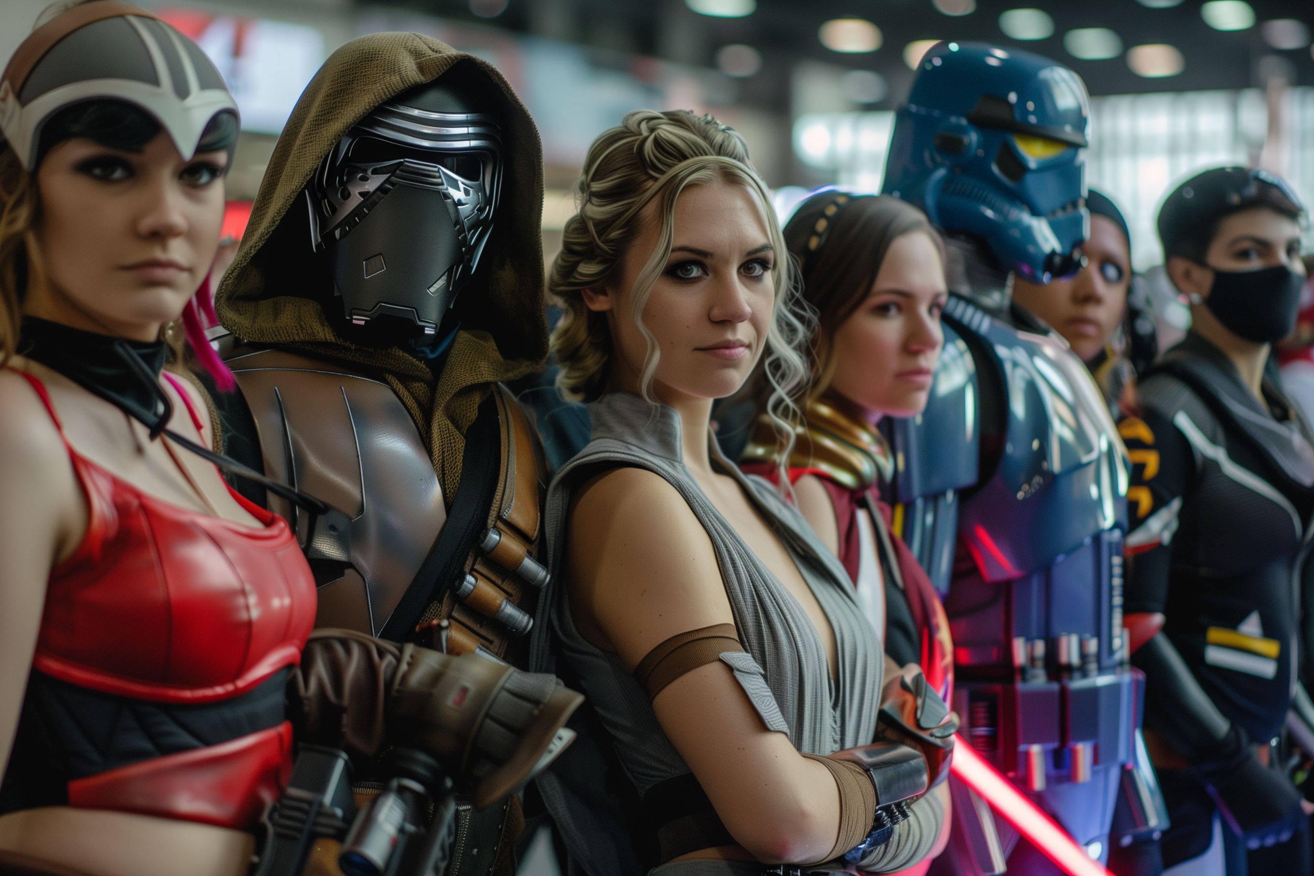 Das Bild zeigt eine Gruppe von Sci-Fi-Charakteren in einer dynamischen Aktion-Pose vor einem düsteren, futuristischen Hintergrund. Die Gruppe besteht aus fünf Personen, darunter ein Mann in einer schwarzen Kampfausrüstung mit Kapuze, eine Frau in einem grauen Outfit mit Lockenfrisur, eine weitere Frau in einem roten Anzug sowie zwei weitere Personen in blauer und grüner Rüstung. Das Bild erzeugt eine spannungsgeladene, filmische Atmosphäre und eignet sich hervorragend für die Verwendung in Blogs, Newslettern, Social-Media-Kanälen und Werbematerialien rund um Themen wie Science-Fiction, Fantasy, Film, Popkultur und Events. Das hochauflösende Foto ist unter einer Creative-Commons-Lizenz verfügbar und kann somit kostenfrei genutzt werden.