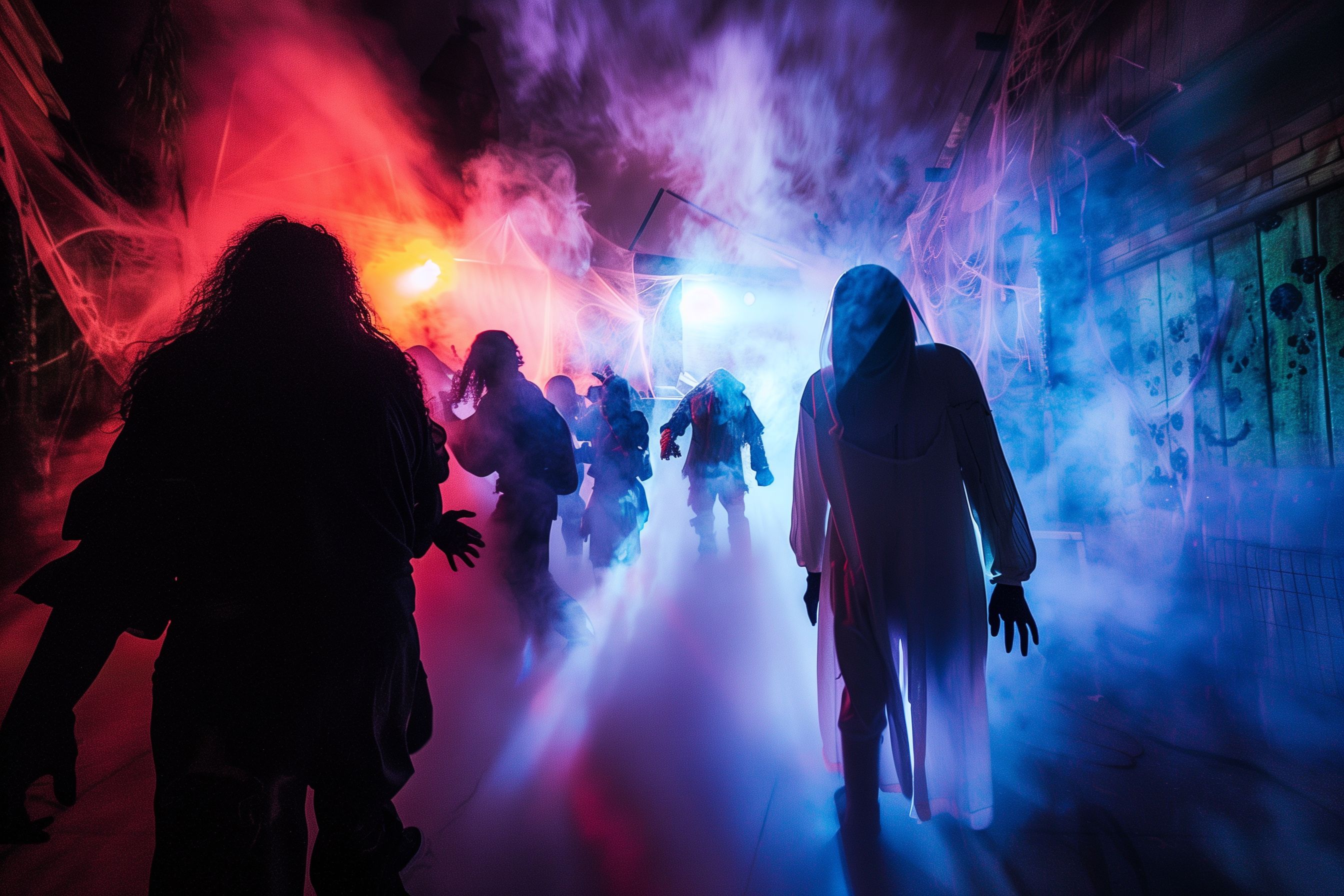 Das Bild zeigt eine mystische und düstere Szenerie, in der schemenhafte Gestalten durch einen farbigen Nebel hindurch zu erkennen sind. Die Beleuchtung ist dramatisch, mit rötlichen und blauen Farbakzenten, die eine geheimnisvolle und bedrohliche Stimmung erzeugen. Die Komposition lenkt den Blick auf die zentralen Figuren, die sich aus der Dunkelheit erheben und eine unwirkliche, fast surreale Atmosphäre schaffen.